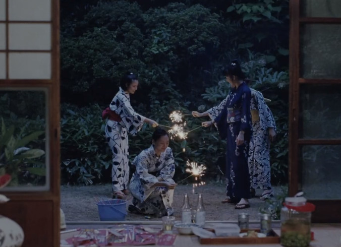 最让人动容的应该数这一幕了,影片接近尾声。镜头视角从房子里打过去,表明是以家庭的视角来看这一幕。幸姐一如既往在最重要的位置,四人手上的烟火已不知不觉连成一线。随后每个人的特写脸上都是挂着笑容的,肯定是烟火带给了人希望与力量。
