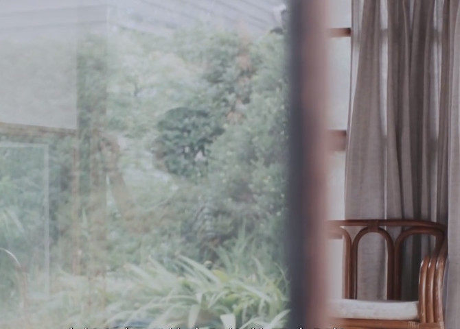 接下来的镜头就更是神了。透过玻璃,小玲在数着身高刻度,屋外草木和人重影,有些虚幻。随后镜头移动,焦点变换,刻度上的年岁更替,幸姐出现在了画面里。好像时光流转,小玲就是在此长大,不曾离开过一般,而幸姐用尺比对着小玲的身高划线,俨然一副慈母形象。