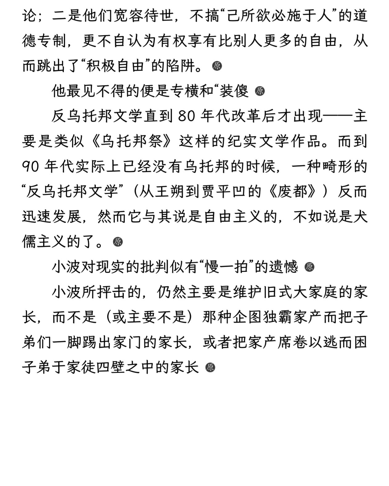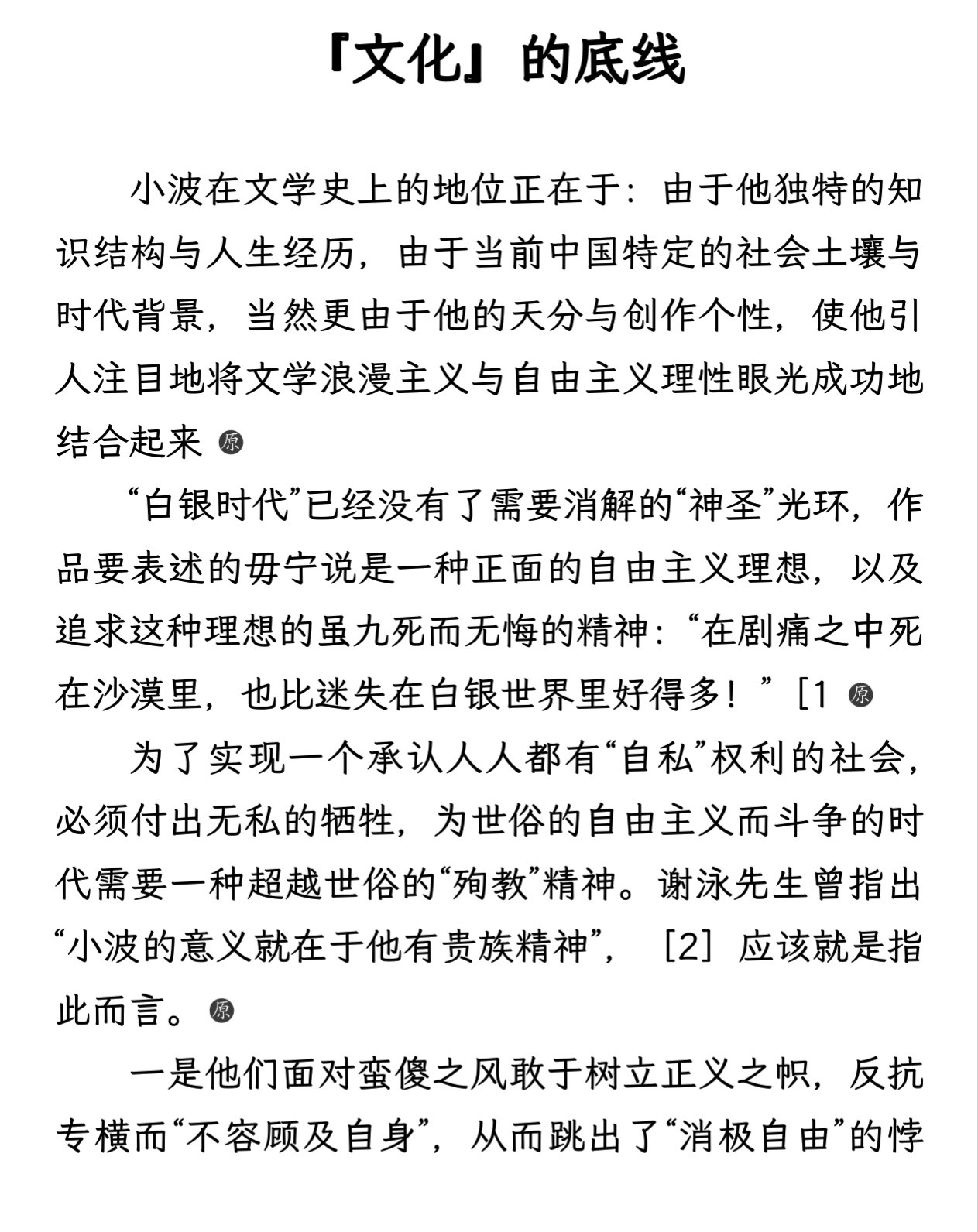 昨天看豆瓣友邻提到秦晖评论王小波的文章《流水前波唤后波》很精彩( https://www.douban.com/people/44747614/status/5814526026/ ),于是去翻出来读了一遍,的确是我看过的最好的一篇对王小波的评论。简洁又精准,肯定和批评都足够深刻,放在当下也依然很有意义,强烈推荐感兴趣王小波的象友们在《共同的底线》 这本书中找一下这篇。