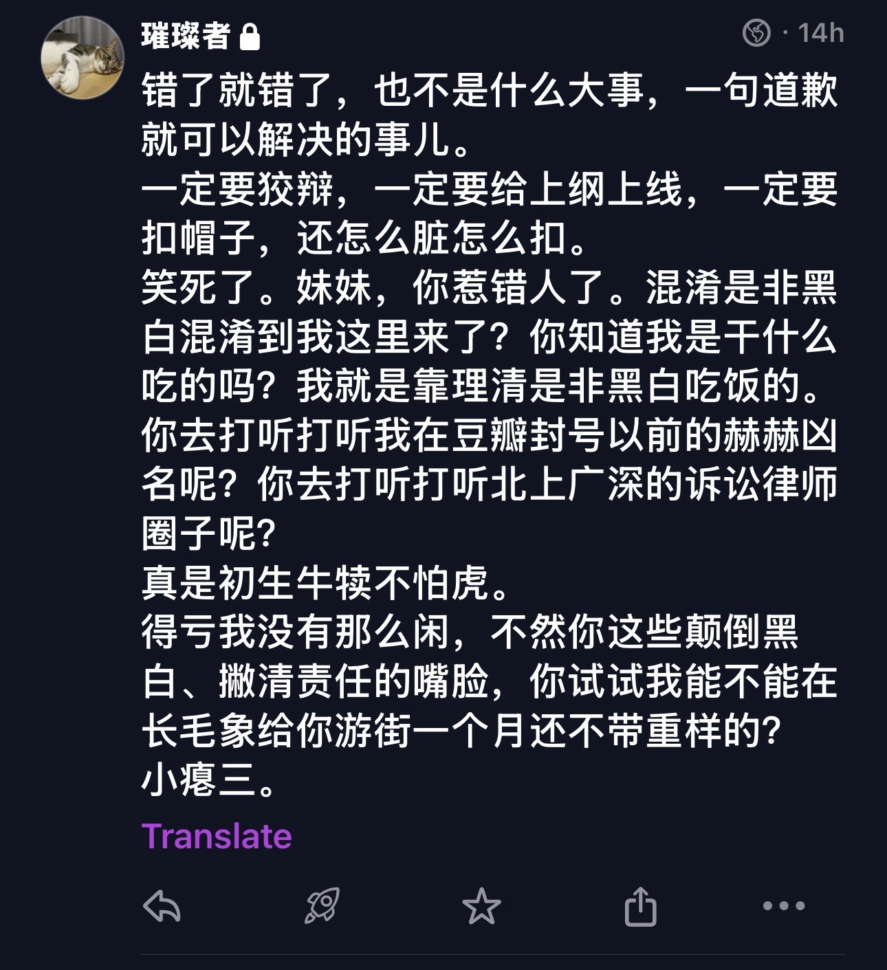 以及既然你威胁我说要让我颠倒黑白、撇清责任的嘴脸在毛象游街一个月,我就也把你颠倒黑白、撇清责任的嘴脸挂在我毛象置顶一个月吧 👍🏻