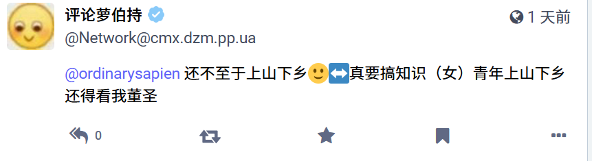 直接在长毛象用董志民玩梗并表示向往,不仅在自己的主页拉,还在别人的评论区留下迷惑评论(这位网友就被无辜影响,评论区其他人也表示迷惑,传送门:https://alive.bar/@ordinarysapien/113452395735767198