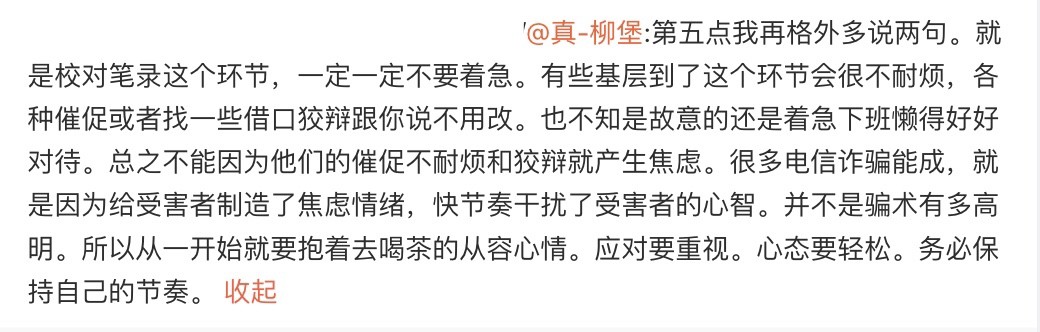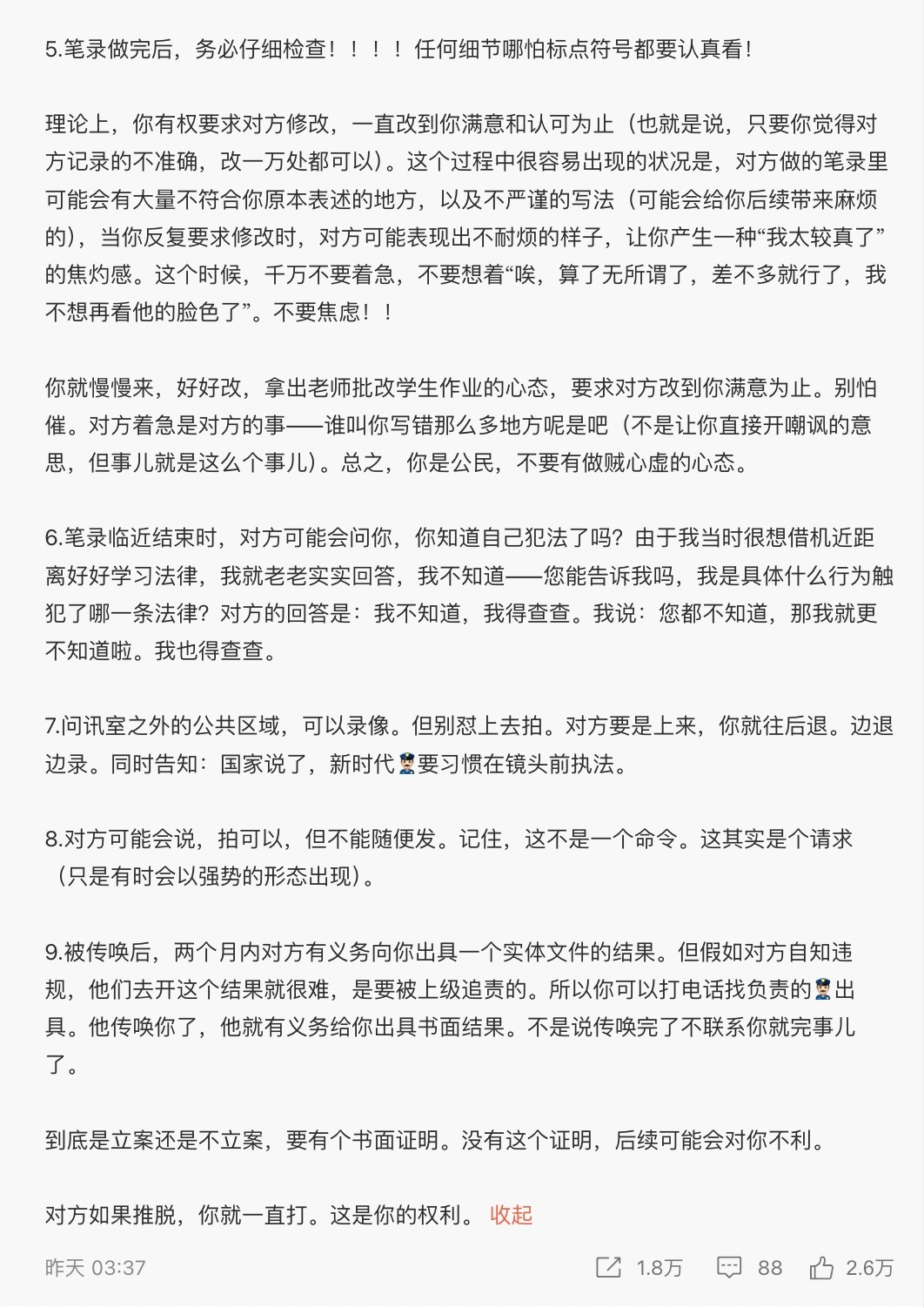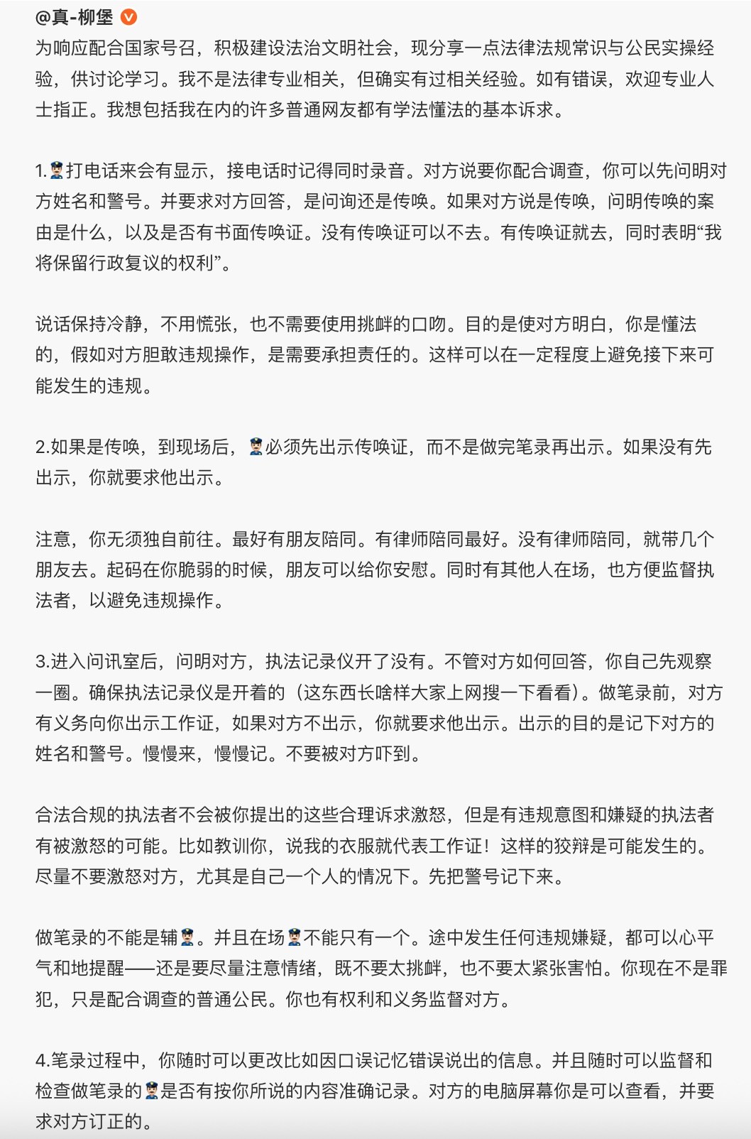 就是不知道,就算像我这样的老油条能做到几分。如果对面是个表面上还想做得合规的警务人员,也许我能复刻到八九分。如果对方本就具备我最憎恶的一些品质(性别歧视/仇女/反智/粗暴/低俗),我的心智会被迅速抽离集中在对抗那些品质对我的压迫上。换句话说,我会进入对抗模式。