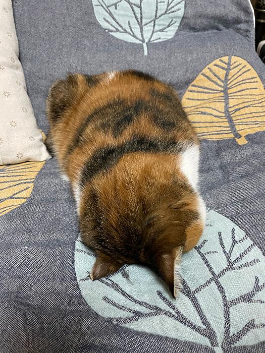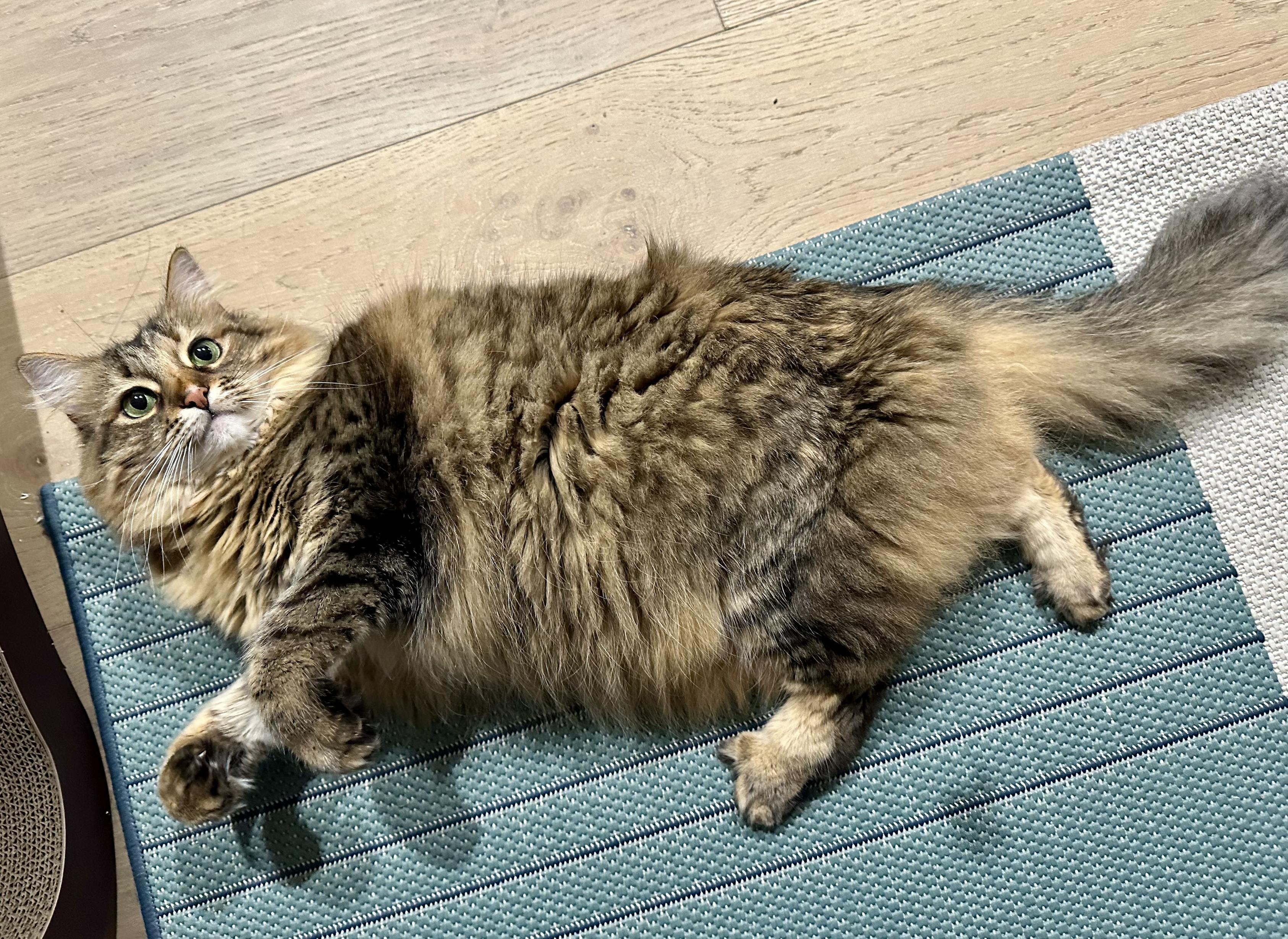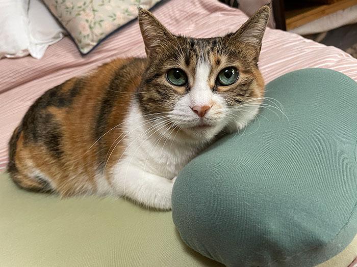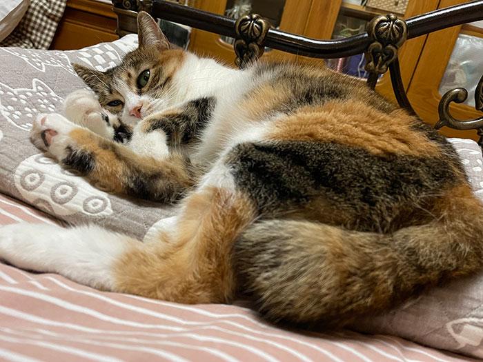 最近停雨了就经常有小猫路过我家院子,我们在家门口放了一个小垫子给他们。晚上真的来了一只小奶牛猫来睡下,起床后伸懒腰也被拍到了😆
