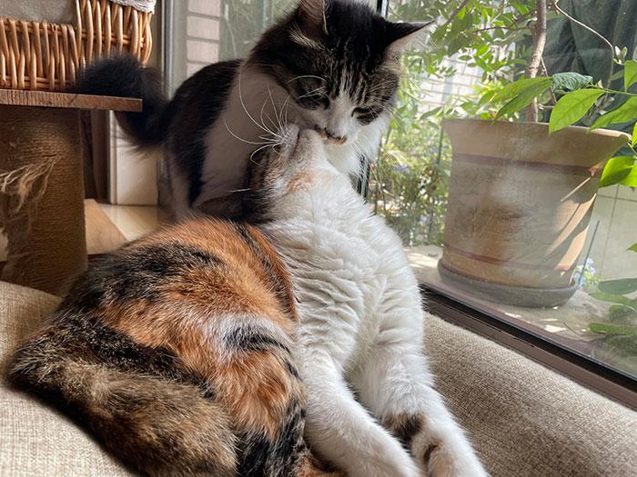 后续:和树懒妈打赌他们这种相依为命的状态能持续多久,树懒赌1小时,树懒妈赌半天。最后到家10分钟后小少爷去闻咪宝的屁股,被哈了,亲密状态宣告结束