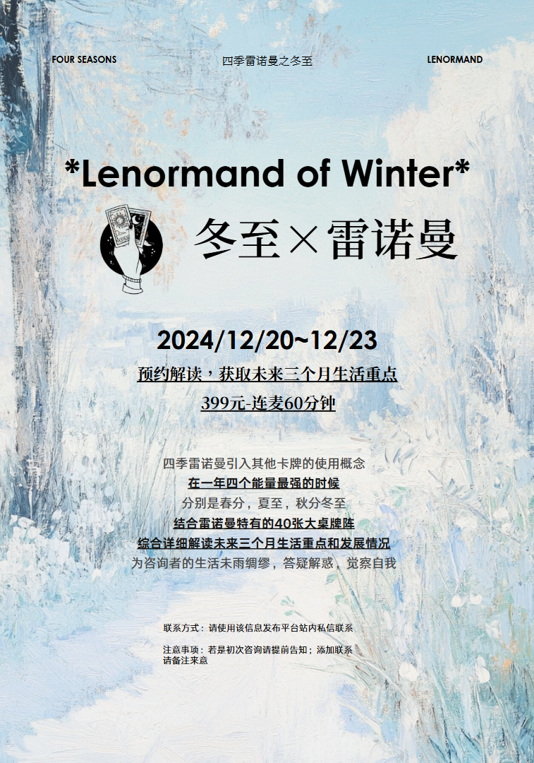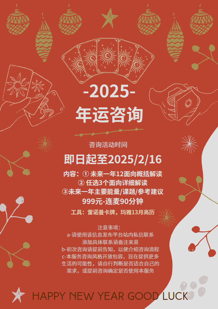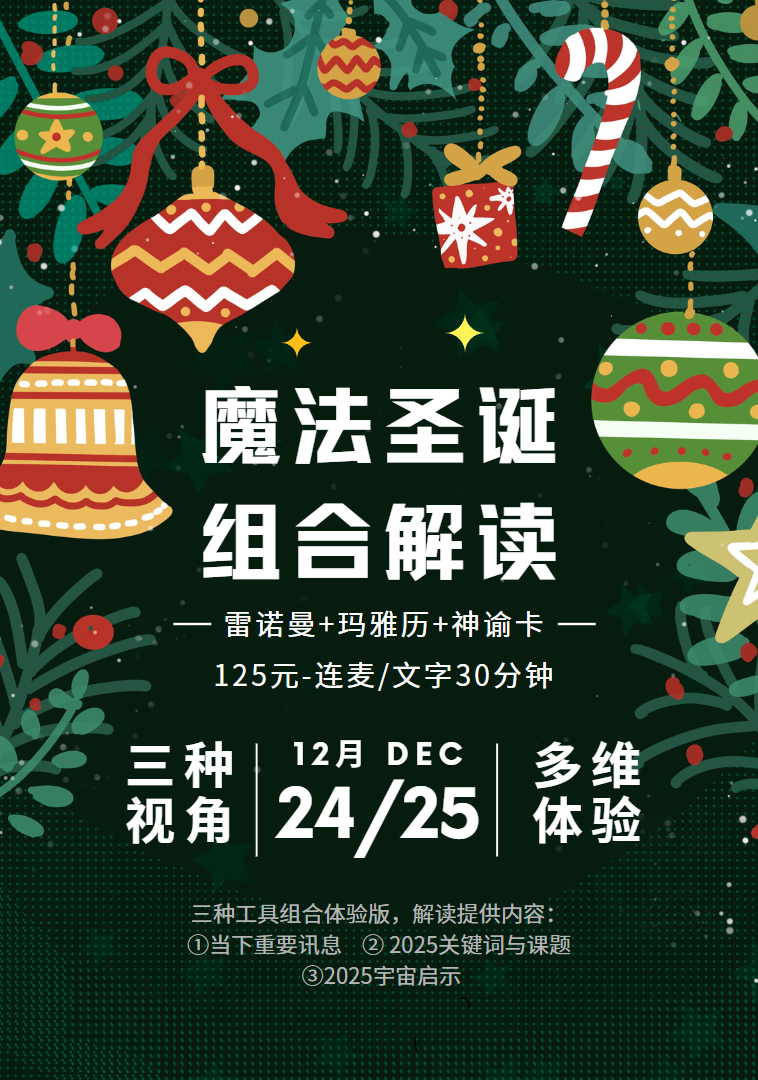 (2)圣诞特别活动:雷诺曼,玛雅13月亮历,神谕卡(含前世今生神谕卡)三种工具结合提供关于2025年的简要,充满启发性的轻量级解读~ 日常180rmb/30min,活动期间125rmb/30min