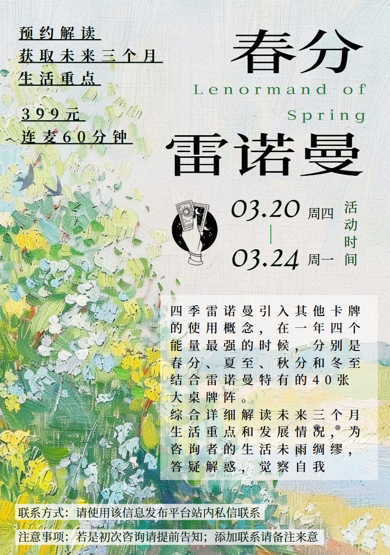 (3)2025年运咨询:我称之为“年度大菜”(?)雷诺曼结合黄道十二宫牌阵提供2025年生活的12个面向概括性解读,并可任选其中三个详细解读(就是可以继续抽牌的意思)接着再结合玛雅13月亮历提供2025年个人专属的关键词/能量/课题等解读。本服务将雷诺曼之精细与玛雅历之开放相结合,旨在提供更具有参考性和可能性的2025年运内容