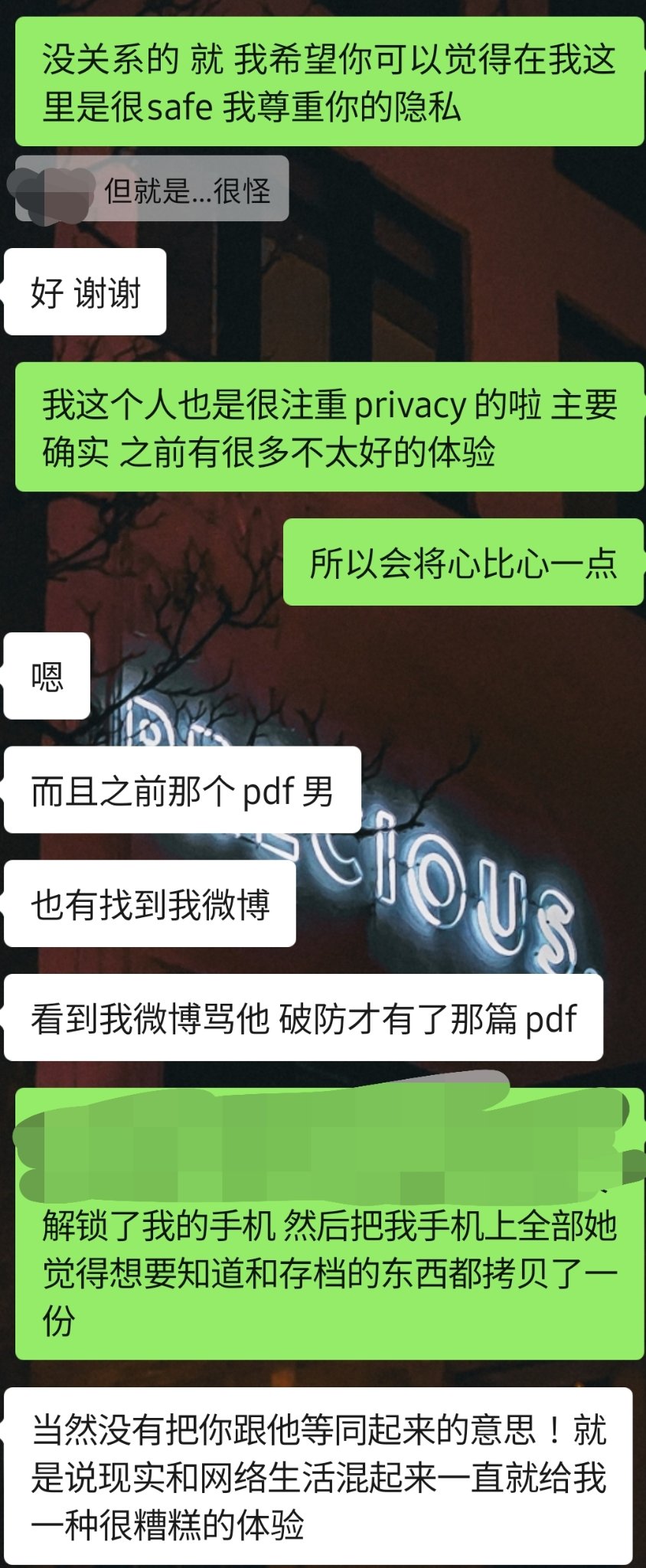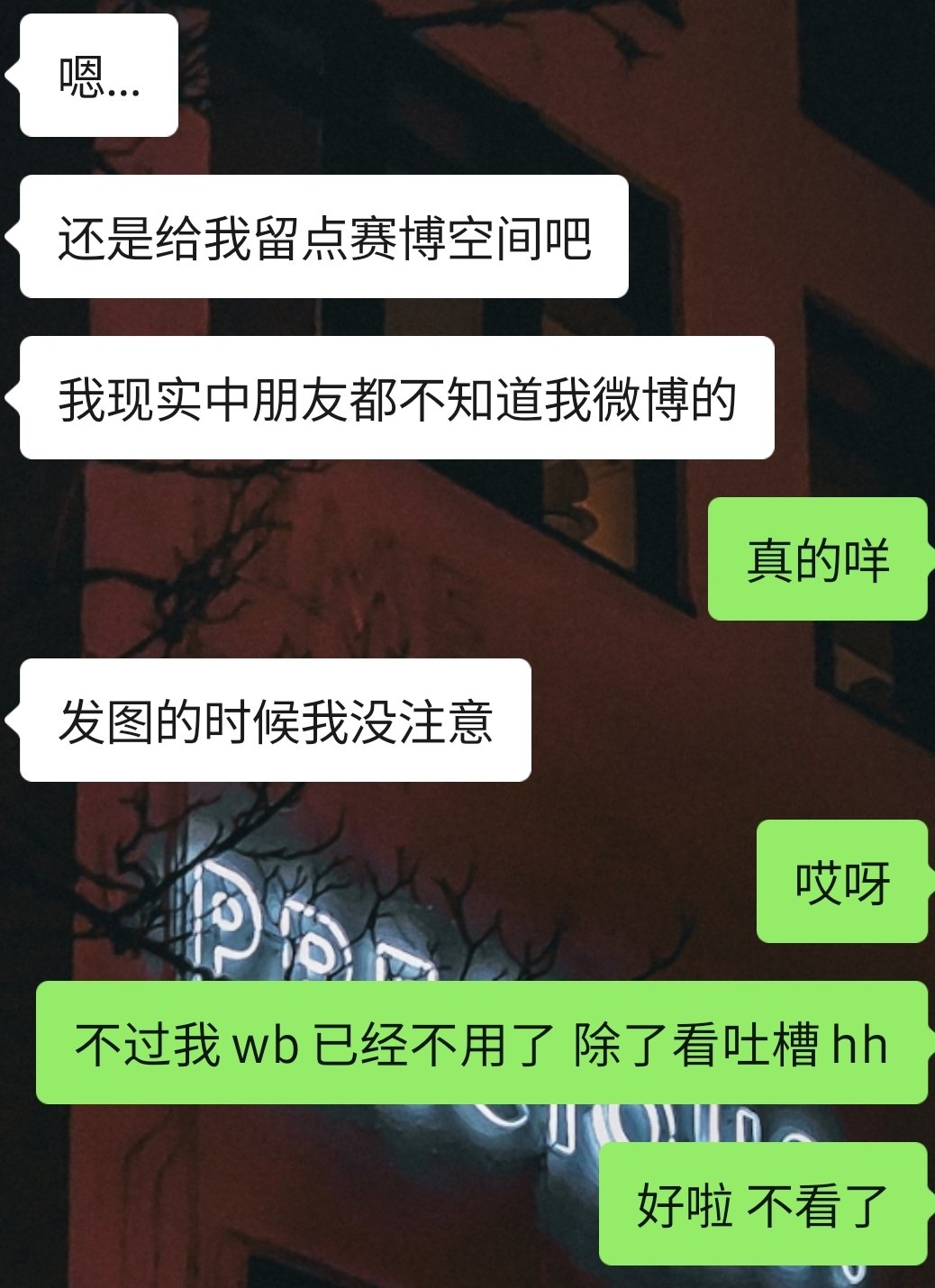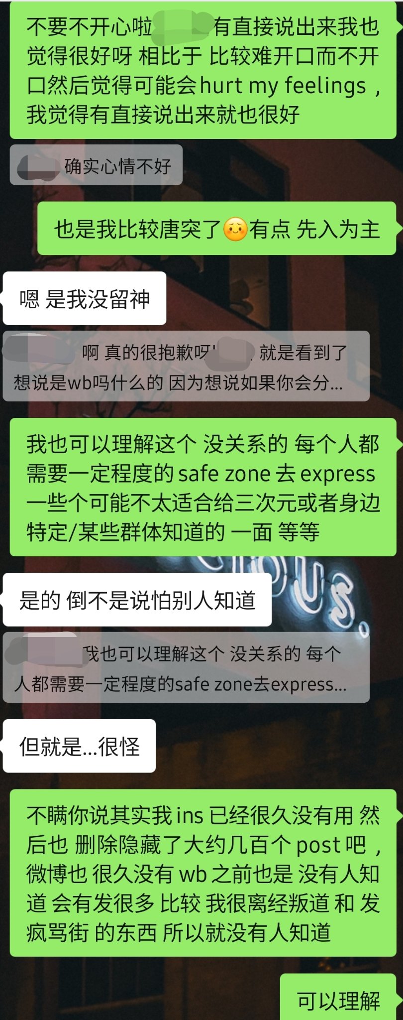 关于突然贴脸加关注这事儿,我真的很讨厌现生三次元的人未经许可突然莫名来加关注,因为赛博空间隐私是真的很需要被维护的。但是我思来想去,又想到之前前交往对象骂我的那条,确实我之前有唐突地给自己之前亲密关系交往对象冒犯到(起因是对方发了微博的图,然后我其实是嘴瓢开玩笑问了一句,没有恶意,但是后面自己觉得也不妥)。