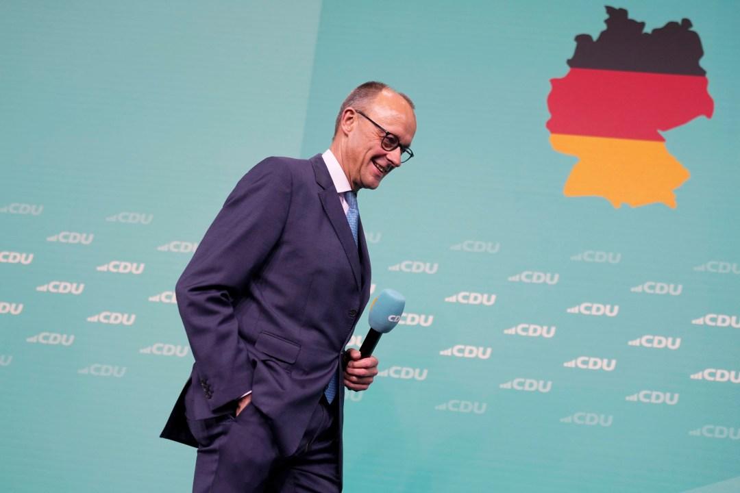 2025年2月23日,德国全国大选结束后,德国保守派联盟(基督教民主联盟+基督教社会联盟)以28.6%的得票赢得德国大选,联盟领导人弗里德里希·梅尔茨(Friedrich Merz)在德国柏林党总部登台向支持者发表讲话。摄:Markus Schreiber/AP/达志影像