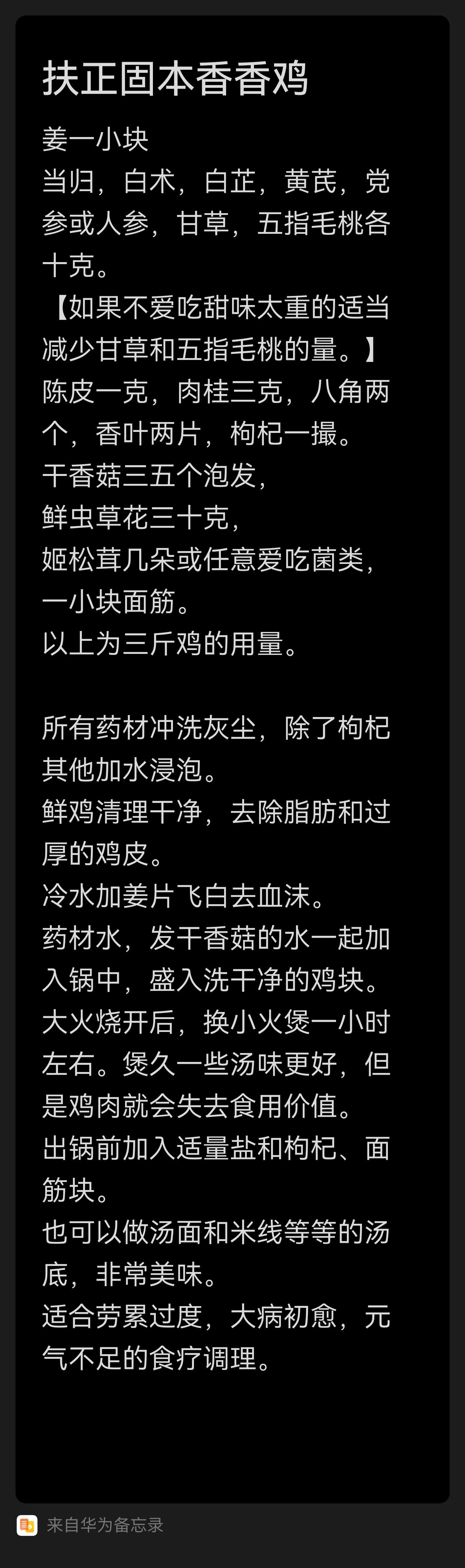 <p><a href="/tags/美食/" rel="tag">#美食</a> <a href="/tags/食谱/" rel="tag">#食谱</a> <a href="/tags/藥膳/" rel="tag">#藥膳</a> <br>研究了固本扶正的药膳鸡汤请大家尝试并且分享给爱的人。<br>适合老年人和疲惫中年人的简单美味,只需配好食材,烹饪交给时间就好!<br>一次性煮多一些冷冻成高汤棒冰,就随时都可以吃到美味药膳汤面了~</p>