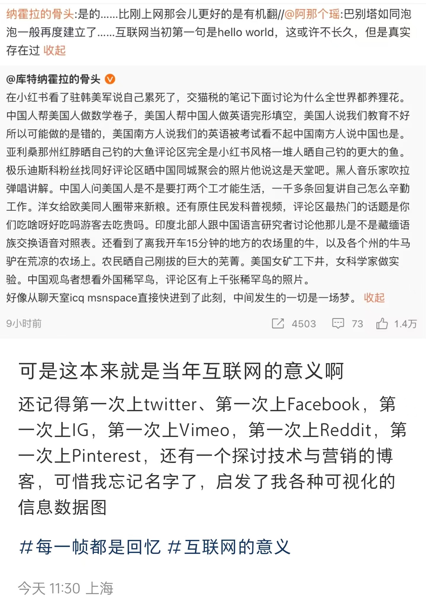 不论小红书会在利维坦沉默的威压下多久内阻止这场交流,让我在这样虚幻的感动中沉溺一夜是一夜吧。08年我在上小学,12年我在用谷歌,我是住在脑海中的那个“地球村”的孩子,互联网对我来说本就该是这样的。在各个行业转一圈之后还是坚定地想进互联网。“信息茧房”、“引流引战”、“996/007”、“螺丝钉”、“35岁被优化”、“猝死”、这是个多么悲哀的决定,可是不做“网络平台”、“社区”、“连接”、“传播交流”的话,我不知道自己该干什么。
