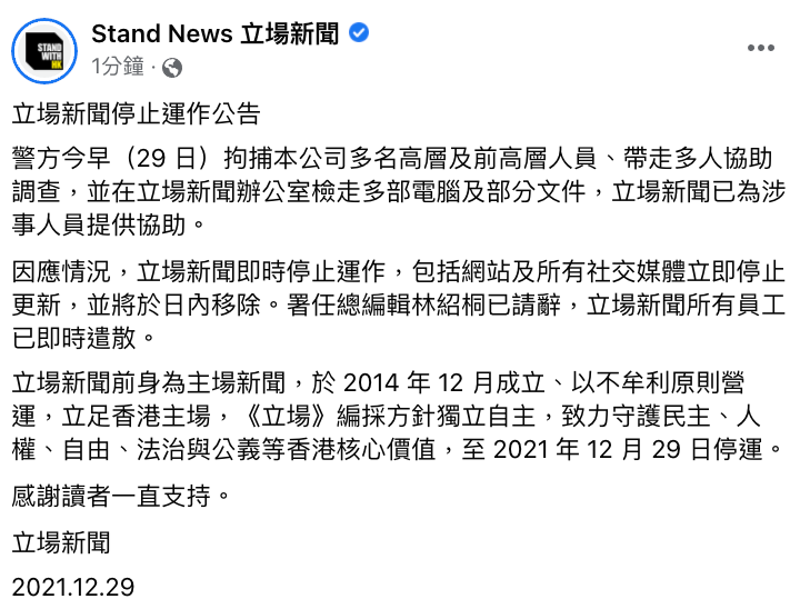 2021年12月29日,《立场新闻》(《立场》)的高层被香港国安处以涉嫌“串谋发布煽动刊物”罪拘捕,办公室也被搜查。当天,《立场》宣布停止运营,并即时遣散员工。香港国安处在记者会称《立场》在国安法实施后仍发布大量“煽动性”内容,企图引导公众对香港政府和司法的憎恨。