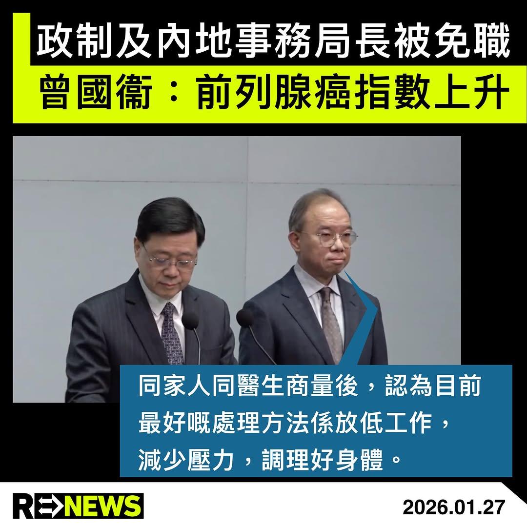 中國國務院今早公布,根據李家超的建議,免去政制及內地事務局曾國衞的職務。李家超今早與曾國衞一同見記者,李家超指早前曾國衞因為健康理由向他辭職,經詳細討論了解其情況後接受他辭職,將由副局長胡健民署任。