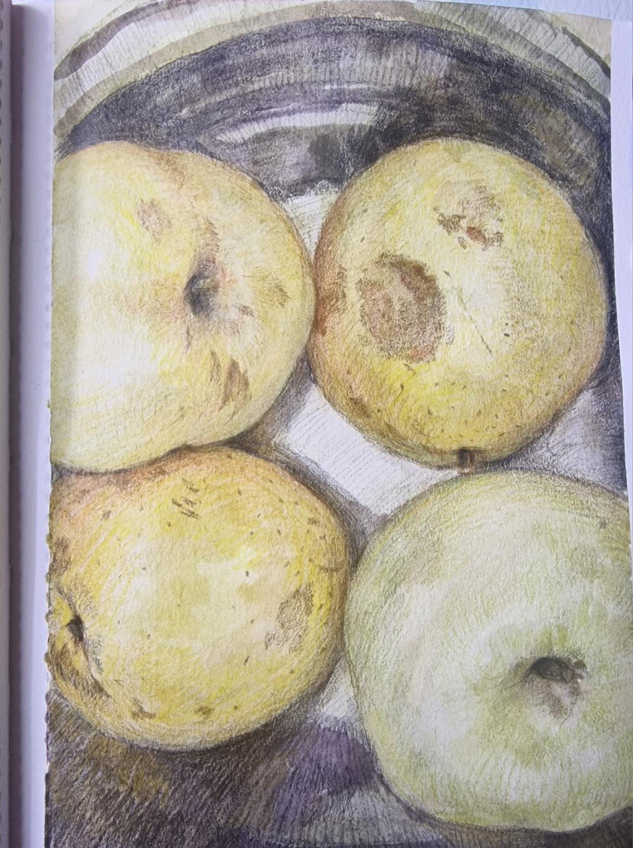 9月底在不吸水的画本上摸的一盆苹果与梨 彩铅激情排线之后上薄薄一层水彩,结果发现一开始彩铅排线用的事初中时候买的水溶性彩铅 只能干了之后用油性彩铅再画