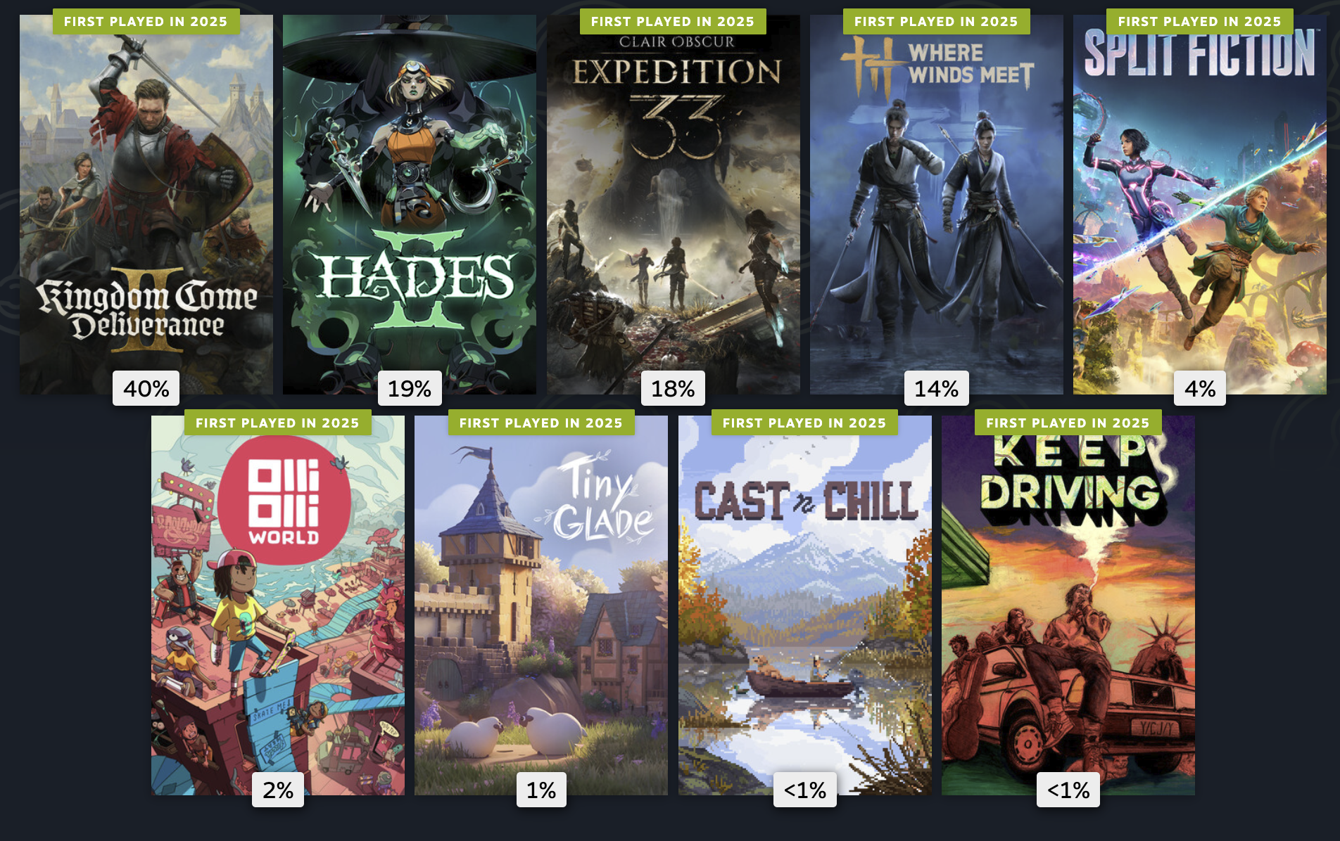 今年的游戏量真是断崖式下跌(而且去年比前年也是下跌了不少了已经)……认真玩了的也就(依次) KCD2,Split Fiction,Hades II,燕云十六声和 33