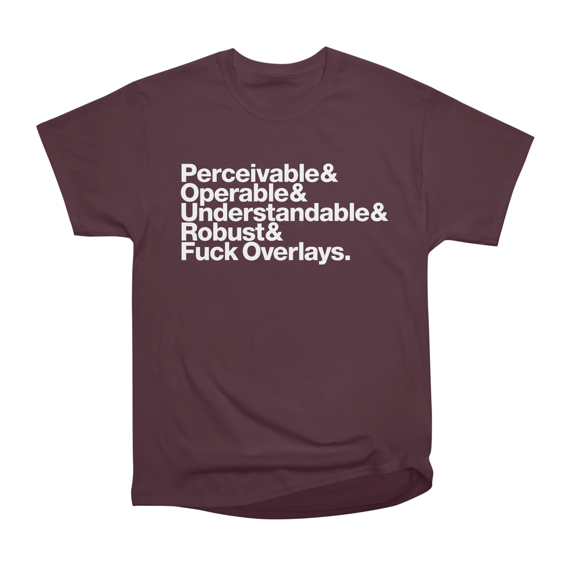 <p>Too late for CSUNATC, but not too late to be the envy of your co-workers.</p><p>Available in multiple colors and styles (can add more if you have a request).</p><p>• Black text: <a href="https://aardrian.threadless.com/designs/pourf-neue-helvetica-black/mens/t-shirt/classic?variation=front&color=yellow_haze" rel="nofollow" class="ellipsis" title="aardrian.threadless.com/designs/pourf-neue-helvetica-black/mens/t-shirt/classic?variation=front&color=yellow_haze"><span class="invisible">https://</span><span class="ellipsis">aardrian.threadless.com/design</span><span class="invisible">s/pourf-neue-helvetica-black/mens/t-shirt/classic?variation=front&color=yellow_haze</span></a><br>• White text: <a href="https://aardrian.threadless.com/designs/pourf-neue-helvetica-white/mens/t-shirt/classic?variation=front&color=maroon" rel="nofollow" class="ellipsis" title="aardrian.threadless.com/designs/pourf-neue-helvetica-white/mens/t-shirt/classic?variation=front&color=maroon"><span class="invisible">https://</span><span class="ellipsis">aardrian.threadless.com/design</span><span class="invisible">s/pourf-neue-helvetica-white/mens/t-shirt/classic?variation=front&color=maroon</span></a></p><p><a href="/tags/wcag/" rel="tag">#WCAG</a> <a href="/tags/overlay/" rel="tag">#overlay</a> <a href="/tags/accessibility/" rel="tag">#accessibility</a> <a href="/tags/a11y/" rel="tag">#a11y</a></p>