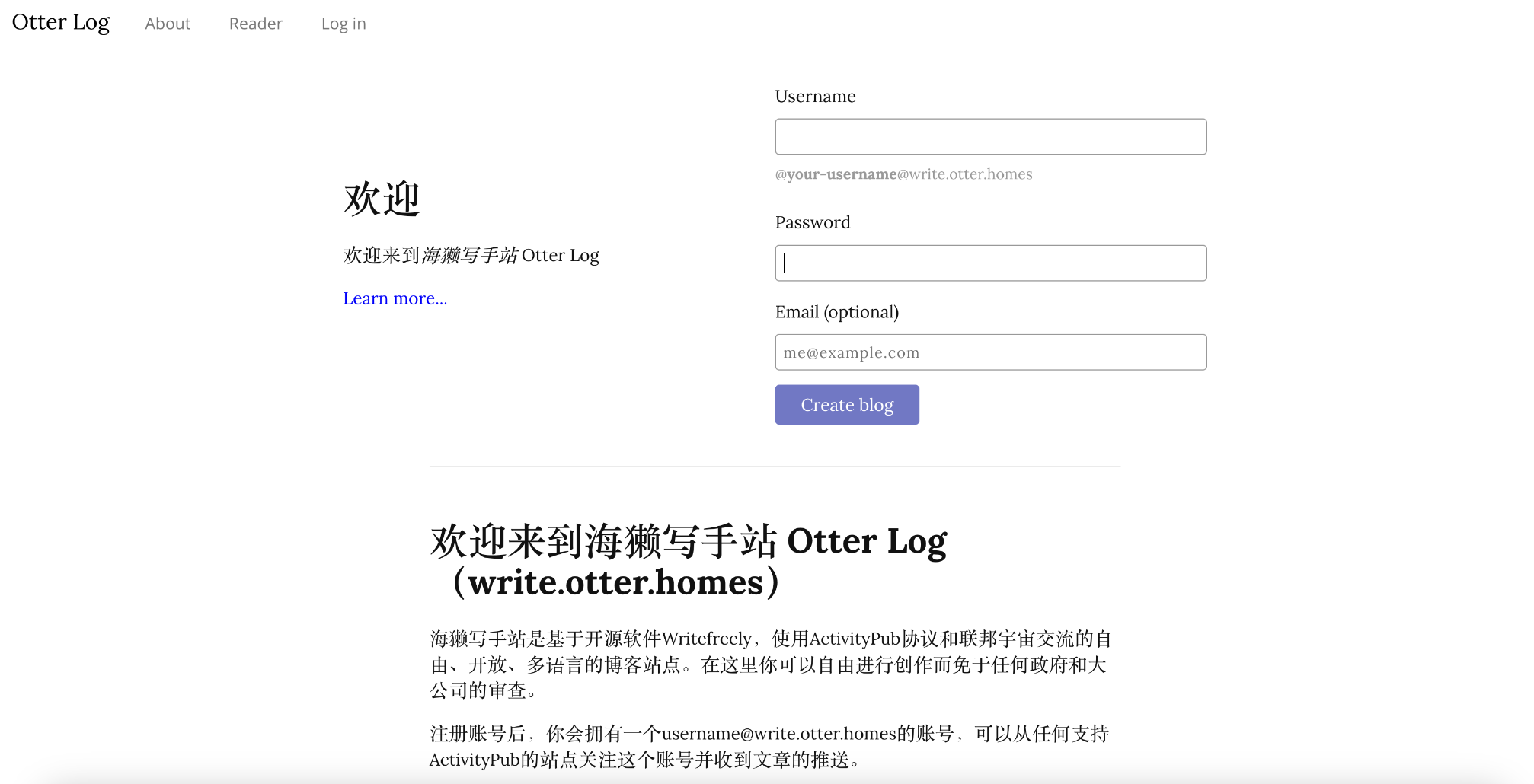 @board Hi大家好,獭站的Writefreely写手站点 https://write.otter.homes 开始试运行并开放注册啦(目前允许5 blogs per user)。