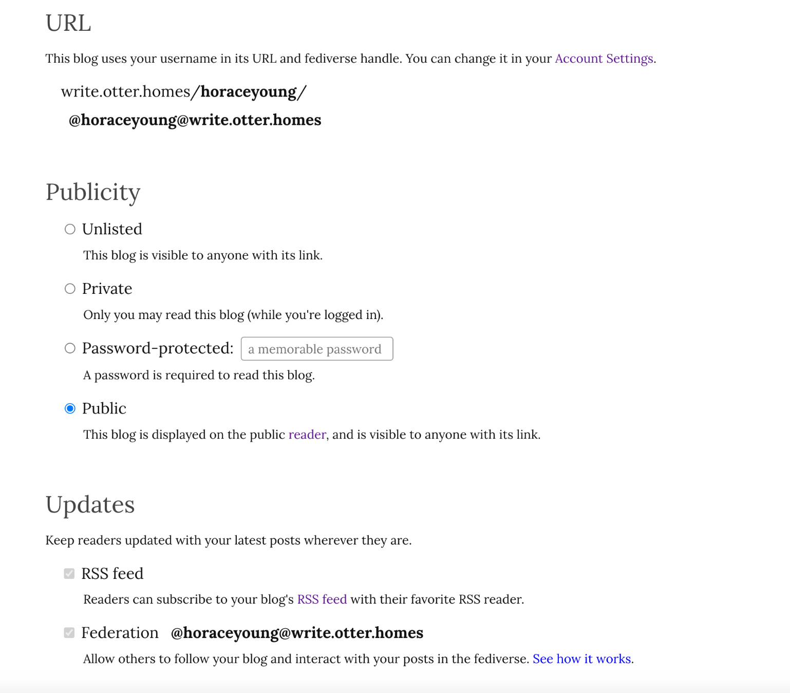 博客可以以write.otter.homes/horaceyoung/的方式被访问,或是以@[email protected]的方式被其他Fediverse账号关注。同时博客会自动生成一个RSS feed,可以被任何RSS Reader订阅。
