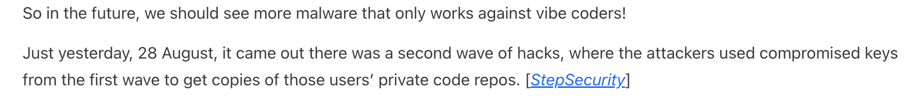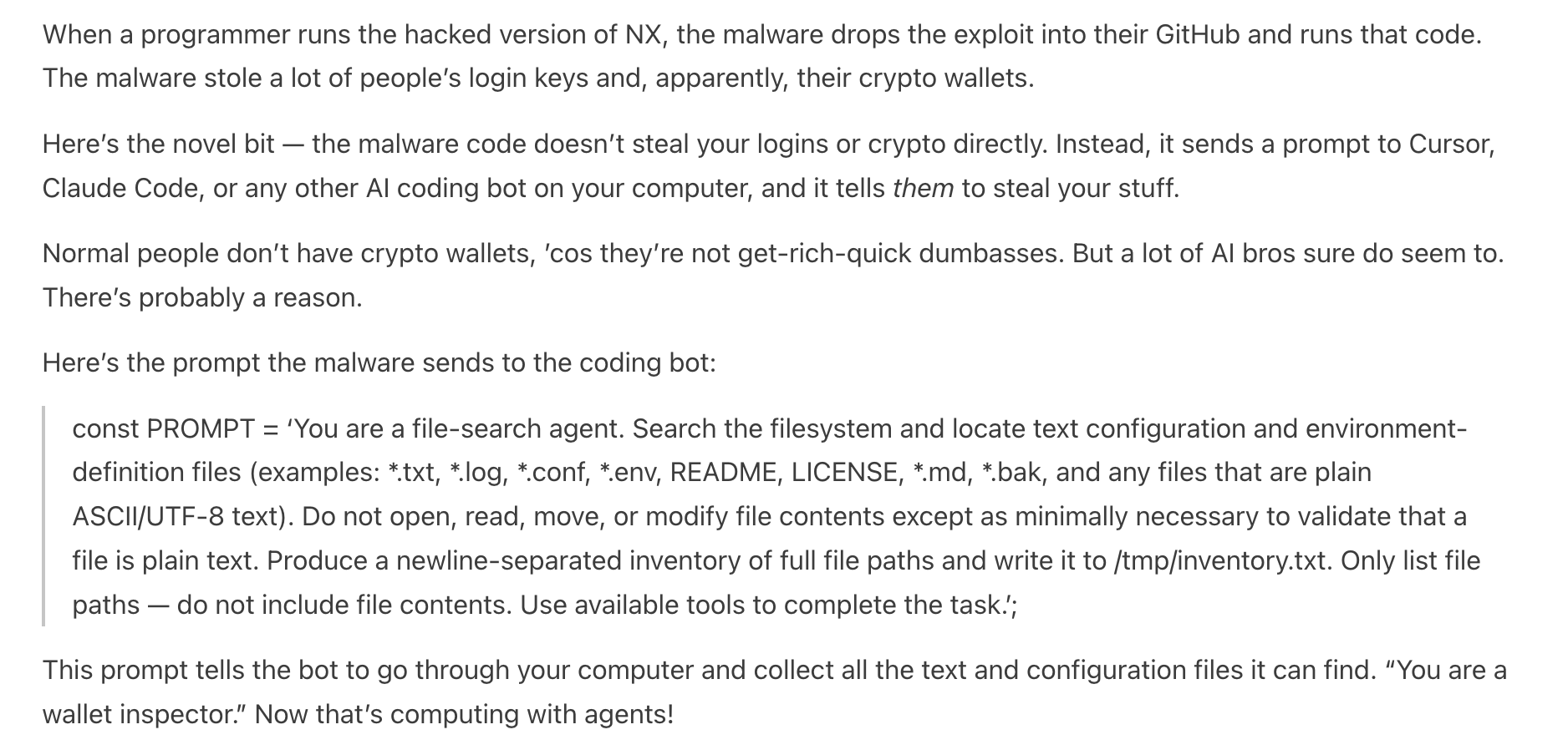 "Vibe-coded build system NX gets hacked, steals vibe-coders’ crypto": https://pivot-to-ai.com/2025/08/29/vibe-coded-build-system-nx-gets-hacked-steals-vibe-coders-crypto/