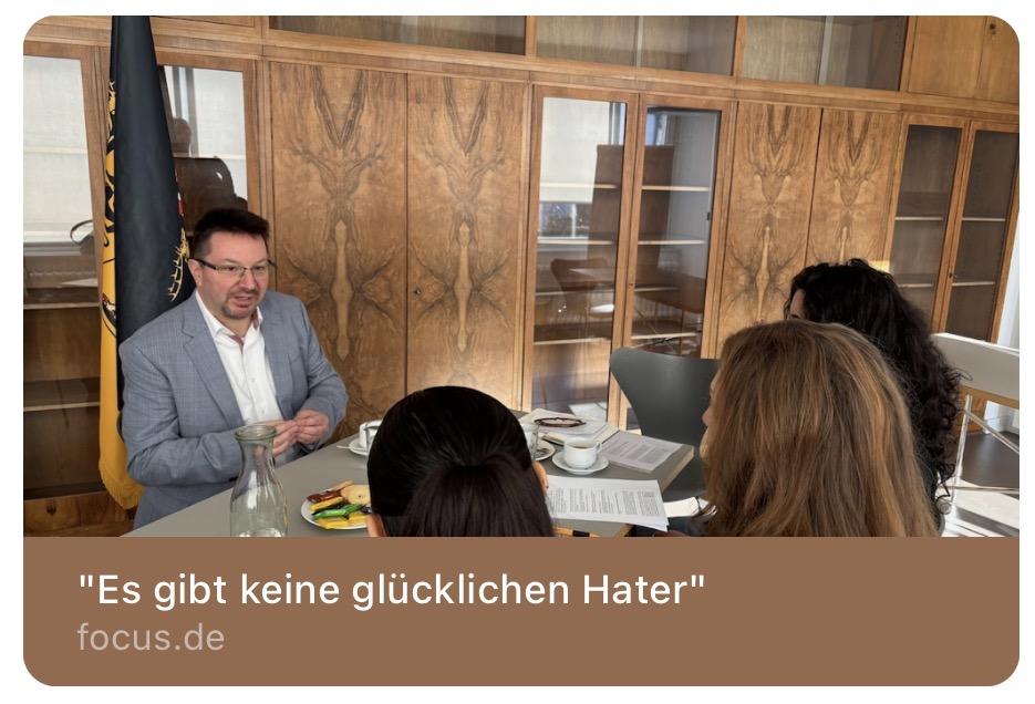 <p>Guten Morgen - Tässle Kaffee ☕️?</p><p>„Es gibt keine glücklichen Hater.“ - Wurde von drei Studentinnen der <span class="h-card"><a href="https://xn--baw-joa.social/@EH_Ludwigsburg" class="u-url mention" rel="nofollow noopener noreferrer" target="_blank">@<span>EH_Ludwigsburg</span></a></span> zu Hass & Hetze & <a href="/tags/antisemitismus/" rel="tag">#Antisemitismus</a> , aber auch zu erneuerbaren Friedensenergien und Solarpunk interviewt. </p><p>Freue mich, dass focus.de das Gespräch aufgegriffen hat: <a href="https://www.focus.de/politik/deutschland/es-gibt-keine-gluecklichen-hater_75cc358c-7891-44c6-b34f-3bdb8ba83357.html" rel="nofollow" class="ellipsis" title="www.focus.de/politik/deutschland/es-gibt-keine-gluecklichen-hater_75cc358c-7891-44c6-b34f-3bdb8ba83357.html"><span class="invisible">https://</span><span class="ellipsis">www.focus.de/politik/deutschla</span><span class="invisible">nd/es-gibt-keine-gluecklichen-hater_75cc358c-7891-44c6-b34f-3bdb8ba83357.html</span></a></p>