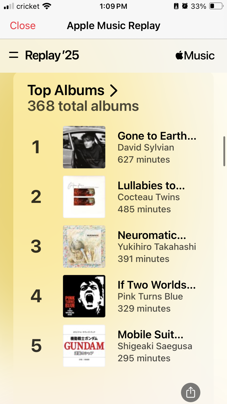 Obviously, The Cure remains GOATed. But I found myself listening to the beautiful orchestral OSTs of Zeta Gundam and CCA quite a bit. David Sylvian is an amazing singer and artist, Gone To Earth was an especially impactful album for me.