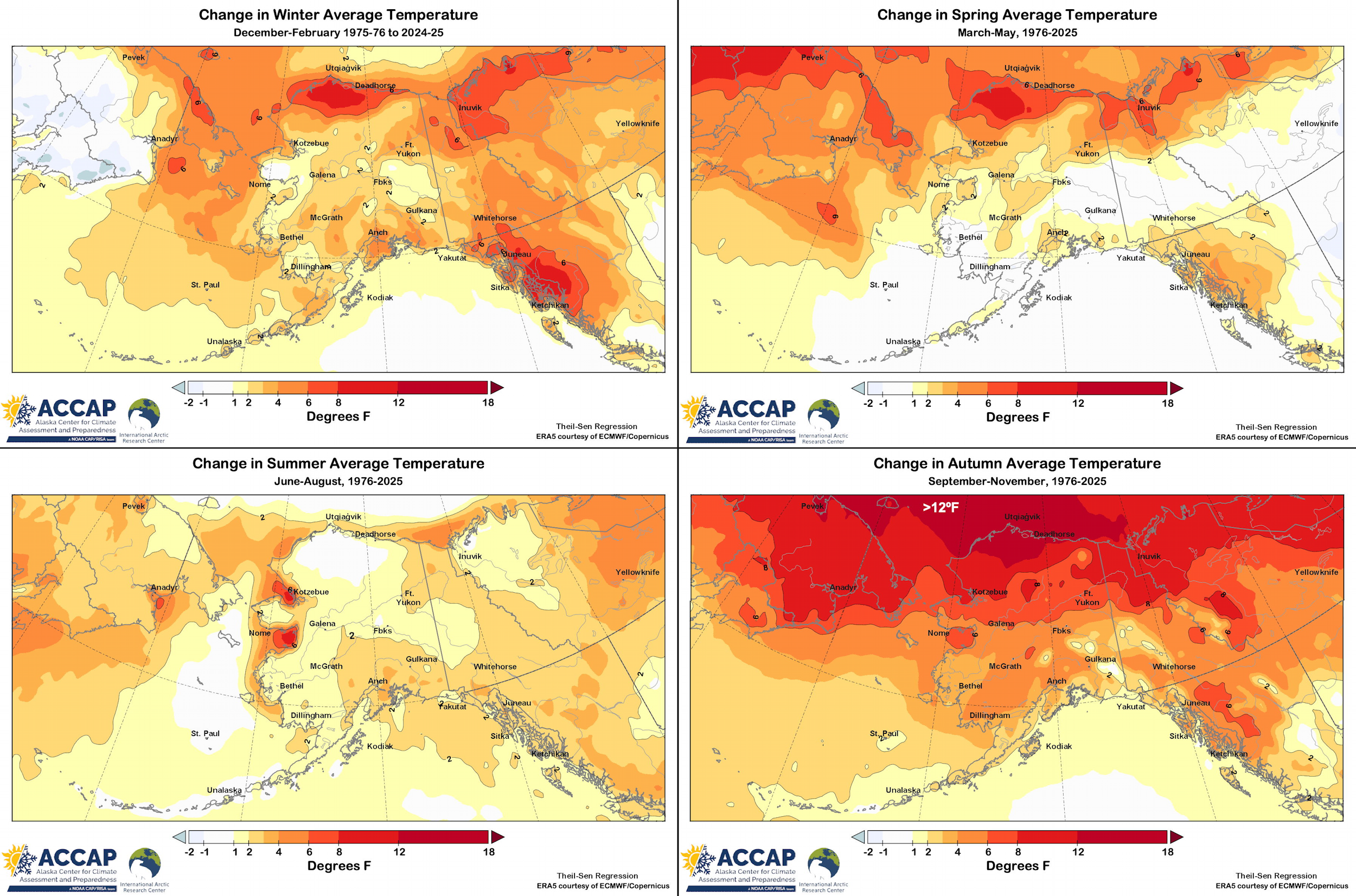 Alaska and vicinity seasonal 50-year temperature changes (ºF) updated through autumn 2025, all in one graphic for your convenience. A whole lot of warming going on. #akwx #Alaska #ClimateChange #Arctic @Climatologist49