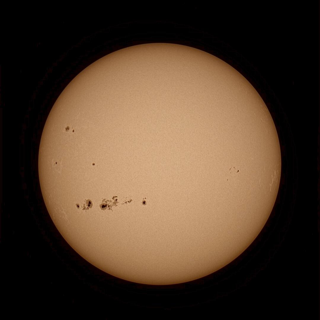 Spectacular #Sunspots visible in this stacked picture of the Sun, taken from North Oxfordshire in the UK today. There are two very (very!) large sunspots visible in the lower third of the disk. Leftmost is 4296 and next to it is 4294. The ‘small one’ to the right is 4298 and that’s about the size of Earth. 4294 and 96 are getting some attention as they are very big and chucking out X flares.