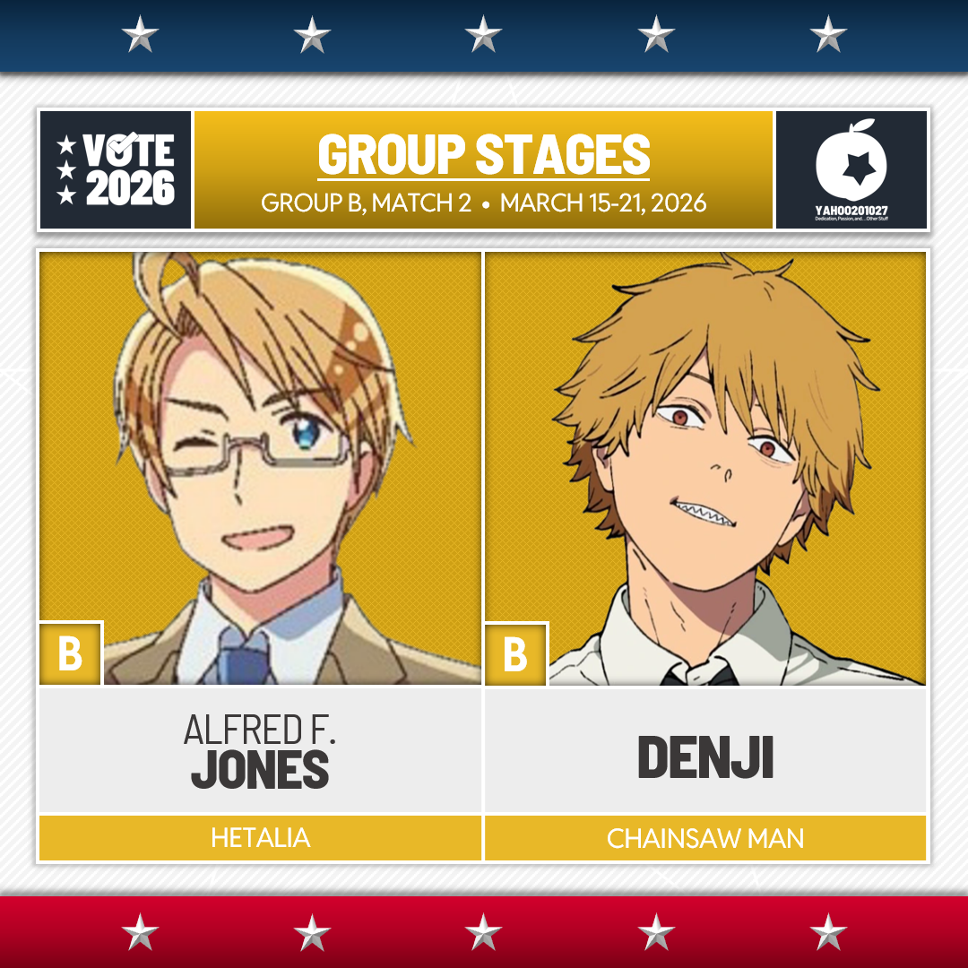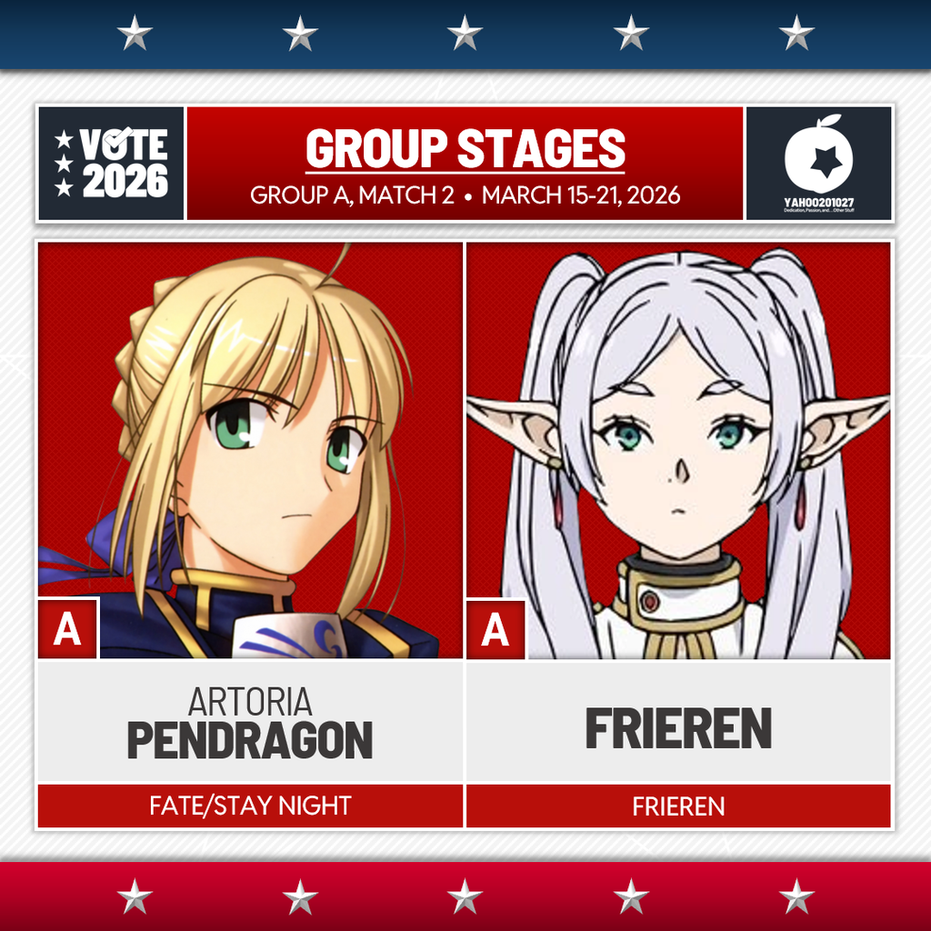 <p>Another set of matches for this week, with three new franchises making their debut and one returning franchise on the ballot. In Group A, it's Artoria Pendragon/Saber (Fate/Stay) taking on Frieren (Frieren). And in Group B, it's Alfred F. Jones/America (Hetalia) taking on Denji (Chainsaw Man). Who will win? You decide! Vote today! </p><p>Group A: <a href="https://rb.gy/rlq9jf" rel="nofollow"><span class="invisible">https://</span>rb.gy/rlq9jf</a> <br>Group B: <a href="https://rb.gy/p3225z" rel="nofollow"><span class="invisible">https://</span>rb.gy/p3225z</a> </p><p><a href="/tags/battleoftheweek/" rel="tag">#BattleOfTheWeek</a> <a href="/tags/botw2026/" rel="tag">#BOTW2026</a> <a href="/tags/fatestaynight/" rel="tag">#FateStayNight</a> <a href="/tags/frieren/" rel="tag">#Frieren</a> <a href="/tags/hetalia/" rel="tag">#Hetalia</a> <a href="/tags/chainsawman/" rel="tag">#ChainsawMan</a> <a href="/tags/anime/" rel="tag">#Anime</a></p>