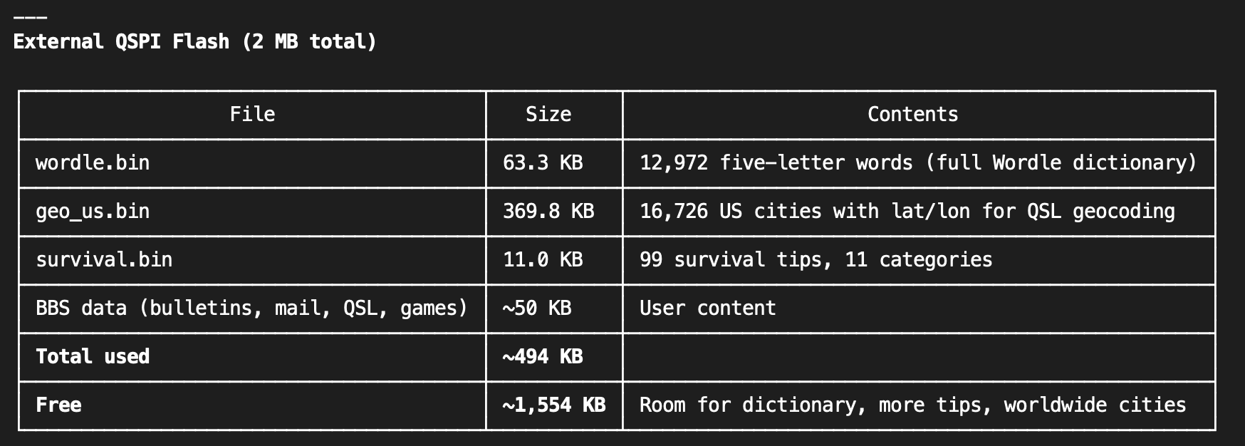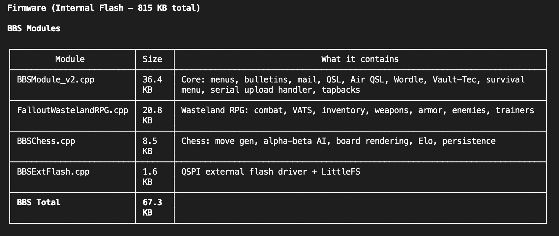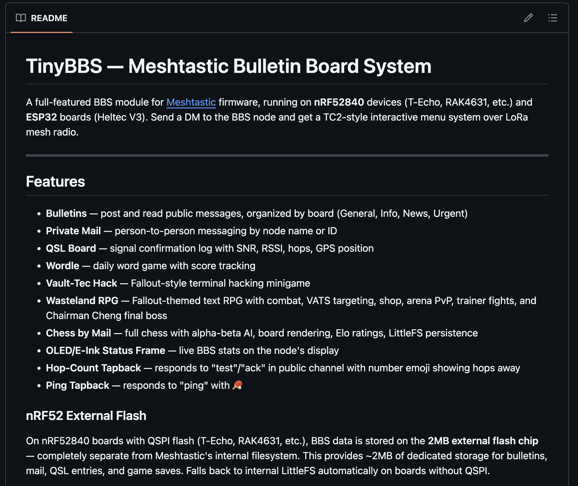 <p>I want to give an update about my project <a href="/tags/tinybbs/" rel="tag">#TinyBBS</a>, a <a href="/tags/meshtastic/" rel="tag">#Meshtastic</a> <a href="/tags/bbs/" rel="tag">#BBS</a> that runs on the meshtastic firmware itself without an rpi. It is now NRF52 based. The NRF is a more lightweight and efficient.<br>The BBS has Email, bulletins, daily wordle, a pretty rich LORD style multiplayer RPG, survival skills, chess, QSLboard, and Airplane QSL Board. The BBS is about 70KB and I do a neat party trick to store knowledge files like a full 12k <a href="/tags/wordle/" rel="tag">#wordle</a> dictionary on the external flash.</p><p><a href="https://github.com/GoatsAndMonkeys/TinyBBS" rel="nofollow" class="ellipsis" title="github.com/GoatsAndMonkeys/TinyBBS"><span class="invisible">https://</span><span class="ellipsis">github.com/GoatsAndMonkeys/Tin</span><span class="invisible">yBBS</span></a></p>