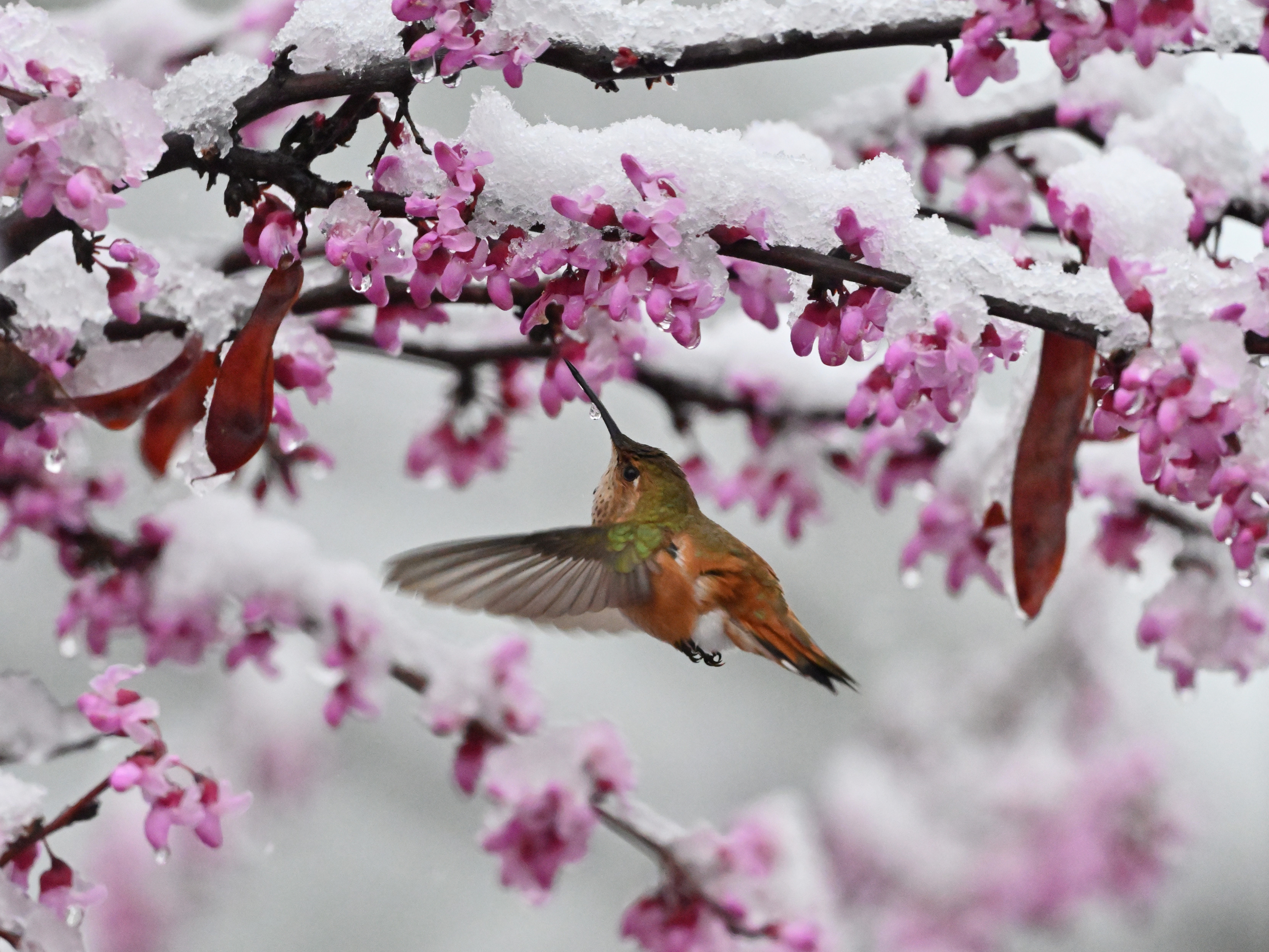 Snowing this Friday morning. Rufous Hummingbird persisting in the snow-covered Redbud.