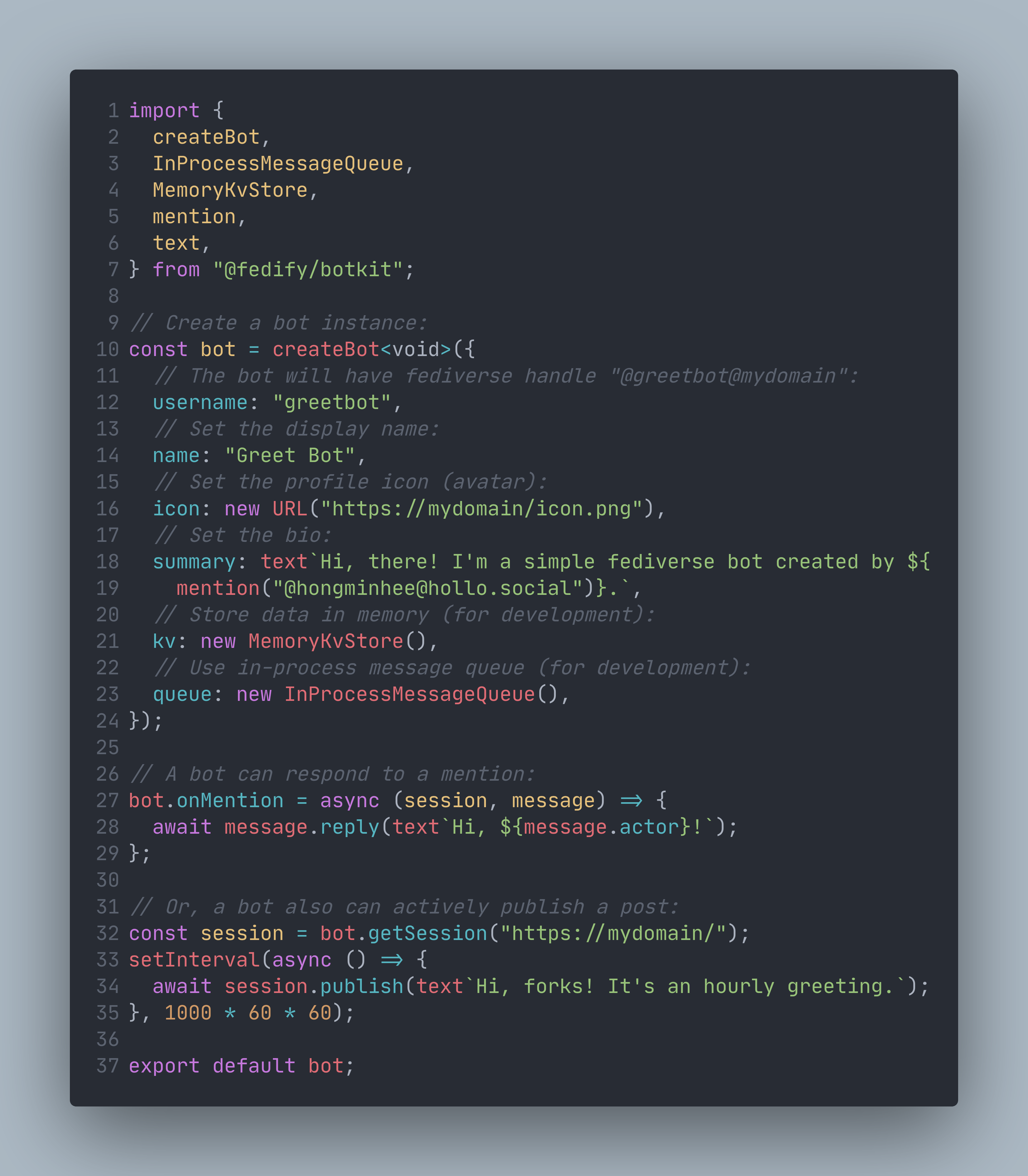 We're pleased to announce the release of BotKit 0.2.0! For those new to our project, #BotKit is a #TypeScript framework for creating standalone #ActivityPub bots that can interact with Mastodon, Misskey, and other #fediverse platforms without the constraints of these existing platforms.