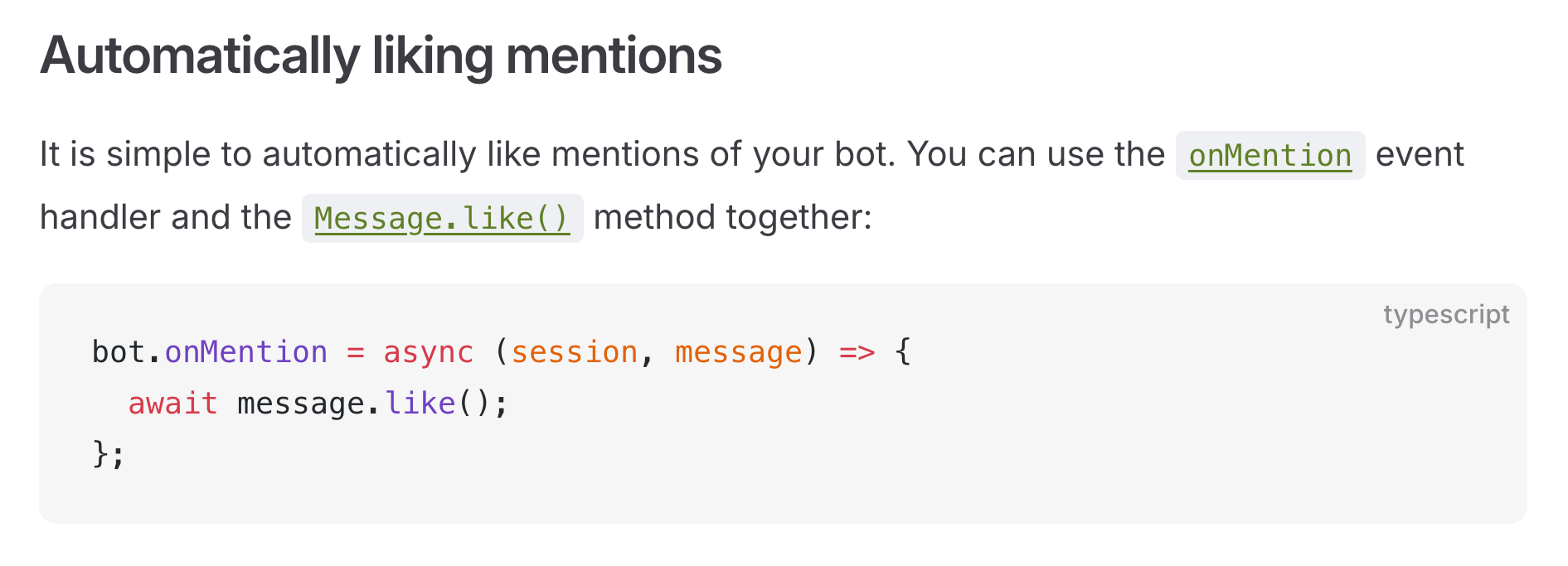 // Quote another message in your bot's postawait session.publish( text`Responding to this interesting point...`, { quoteTarget: originalMessage });// Handle when users quote your bot's messagesbot.onQuote = async (session, quoteMessage) => { await session.publish( text`Thanks for sharing my thoughts, ${quoteMessage.actor}!`, { visibility: "direct" } );};