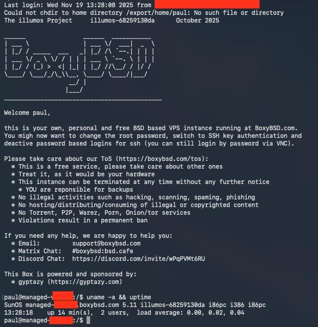 I had to give @BoxyBSD a try and it is really amazing! Just got an #illumos box running there for free and it works without any issues. So, not only #BSD based systems, but also #opensolaris is supported at @gyptazy's amazing service. Thank you very much for this service. Btw, you could add real home directories for the created user ;)