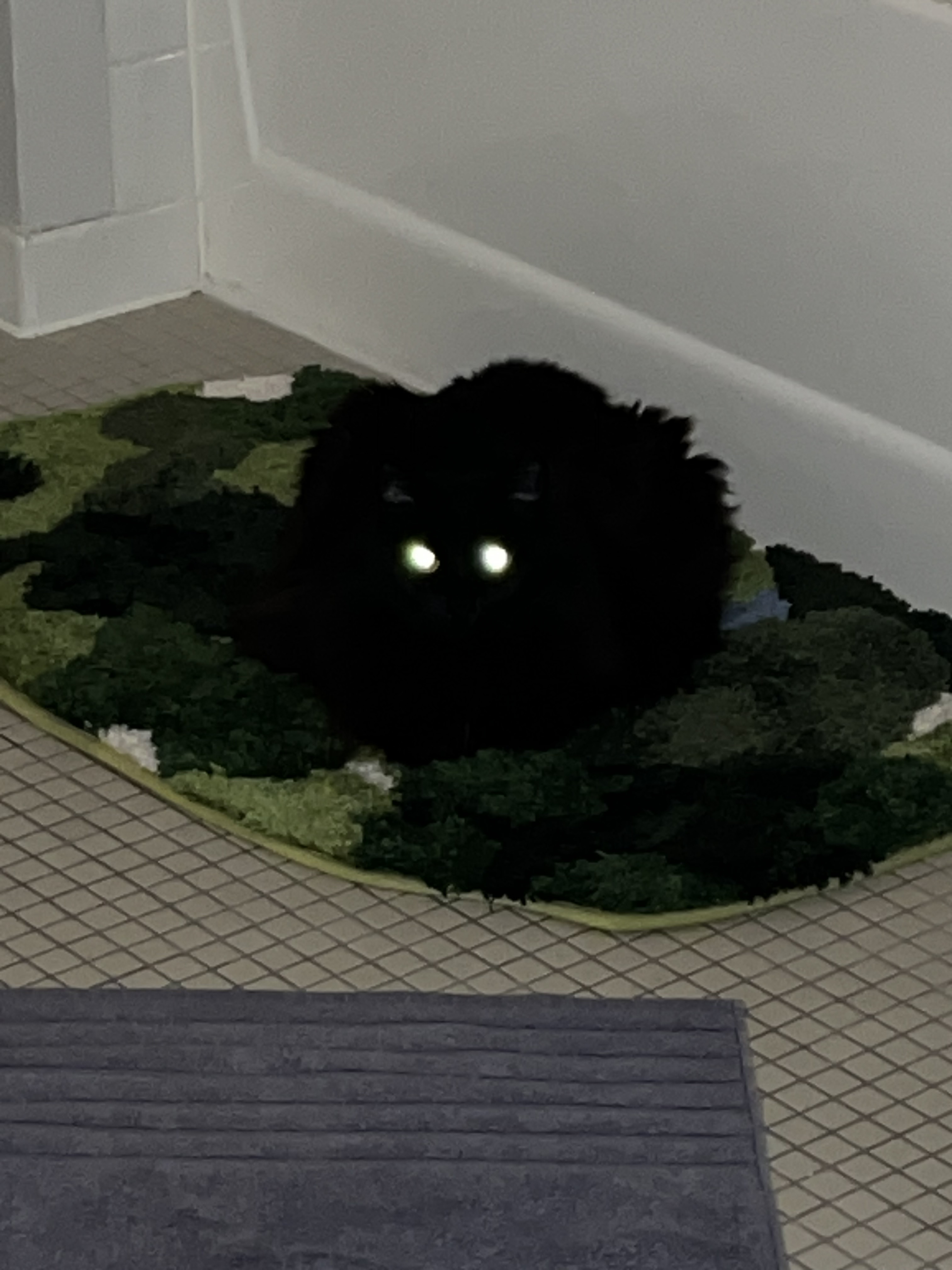 A black cat in the green grass in my garden - she looks at me with her big green eyes.