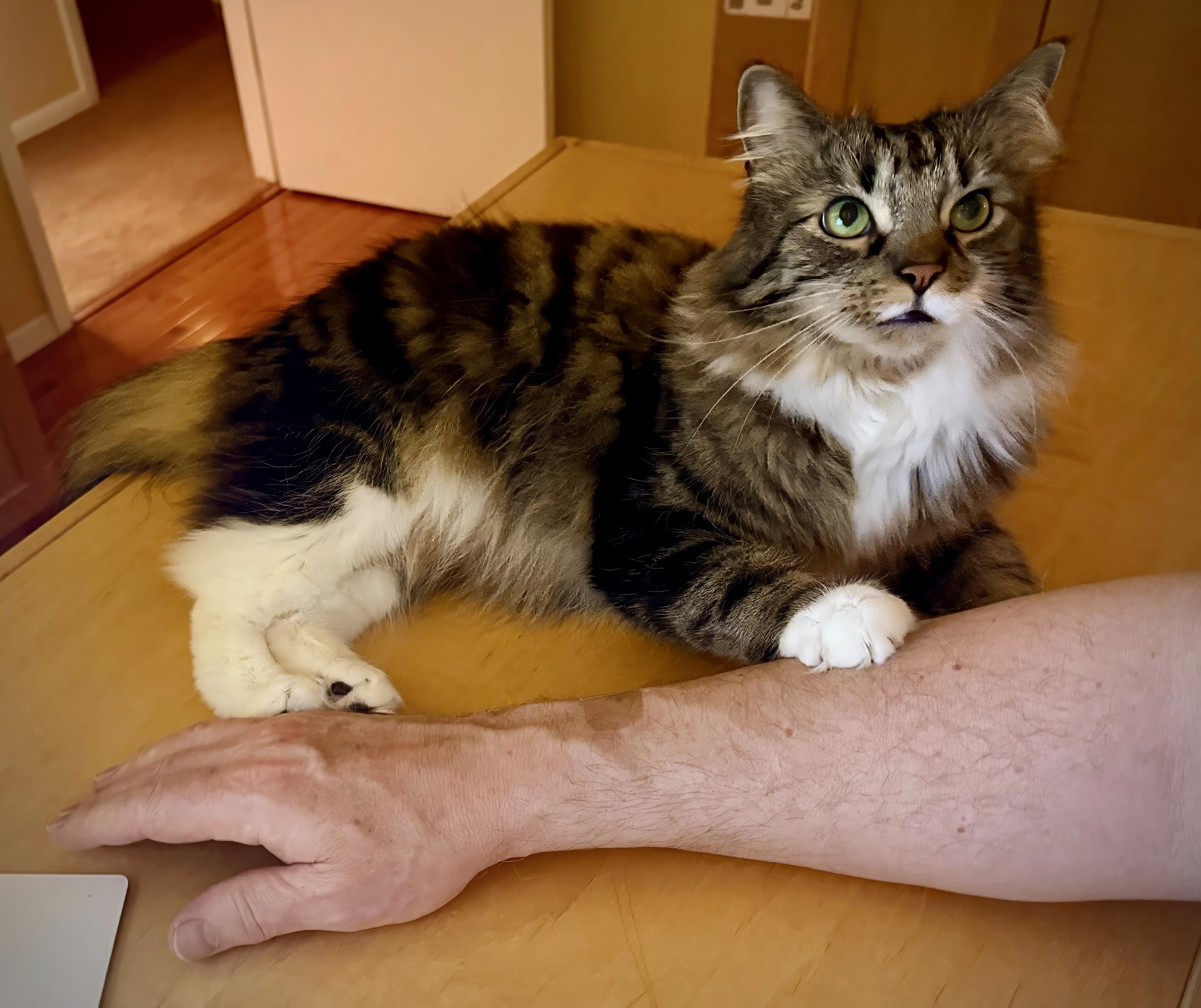 <p>I took this photo last <a href="/tags/caturday/" rel="tag">#Caturday</a> after returning home from a trip. My shy boy, Emmett, was clearly happy to have his papa back home. 😸 <a href="/tags/catsofmastodon/" rel="tag">#CatsOfMastodon</a> <a href="/tags/cats/" rel="tag">#Cats</a></p>