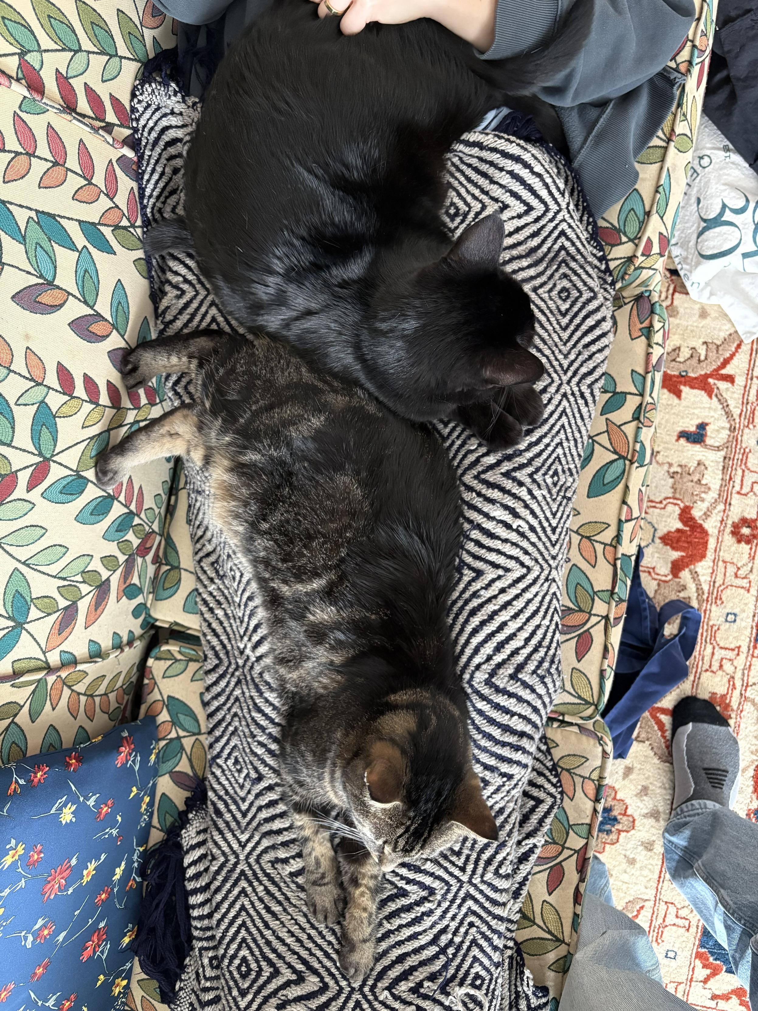 <p>Our cats are constantly cuddling. We have an oddly harmonious group of animals, dogs and cats. Better than everyone trying to kill each other I suppose. Well Maddy still does a fair amount of threatening the others. She's only 12 lbs so two cats out weigh her. 😂</p><p><a href="/tags/catsofmastodon/" rel="tag">#catsofmastodon</a></p>