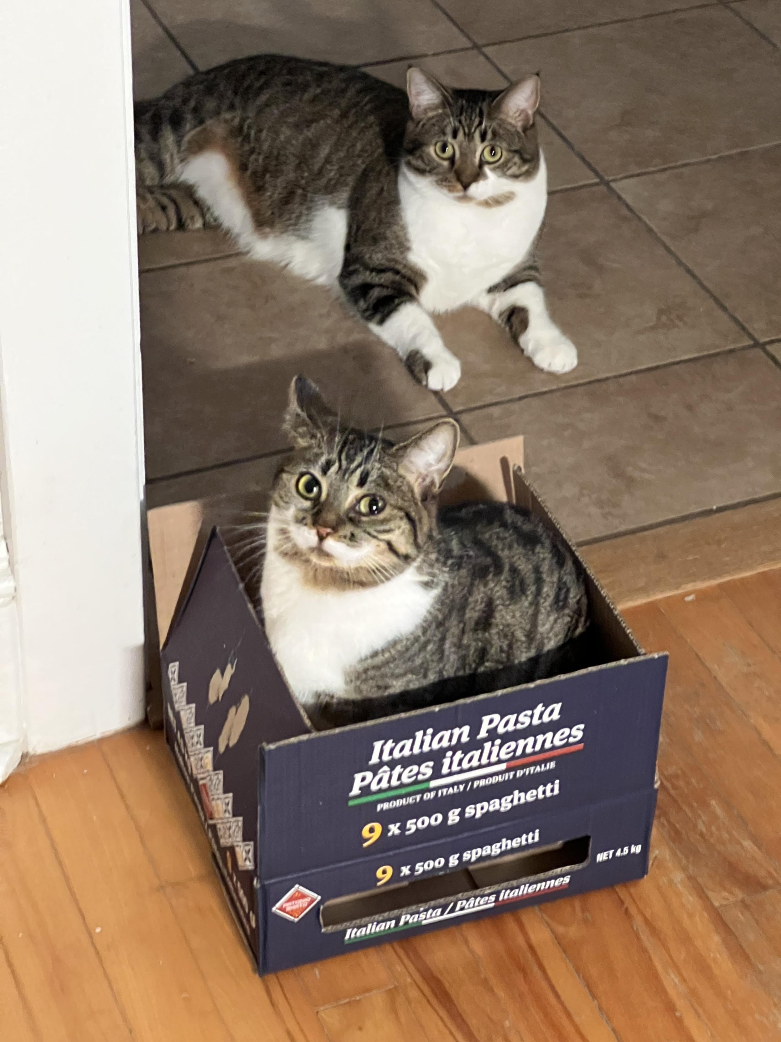 New box!!! #CatsOfMastodon #RipleyAndJonesy #BoxCat