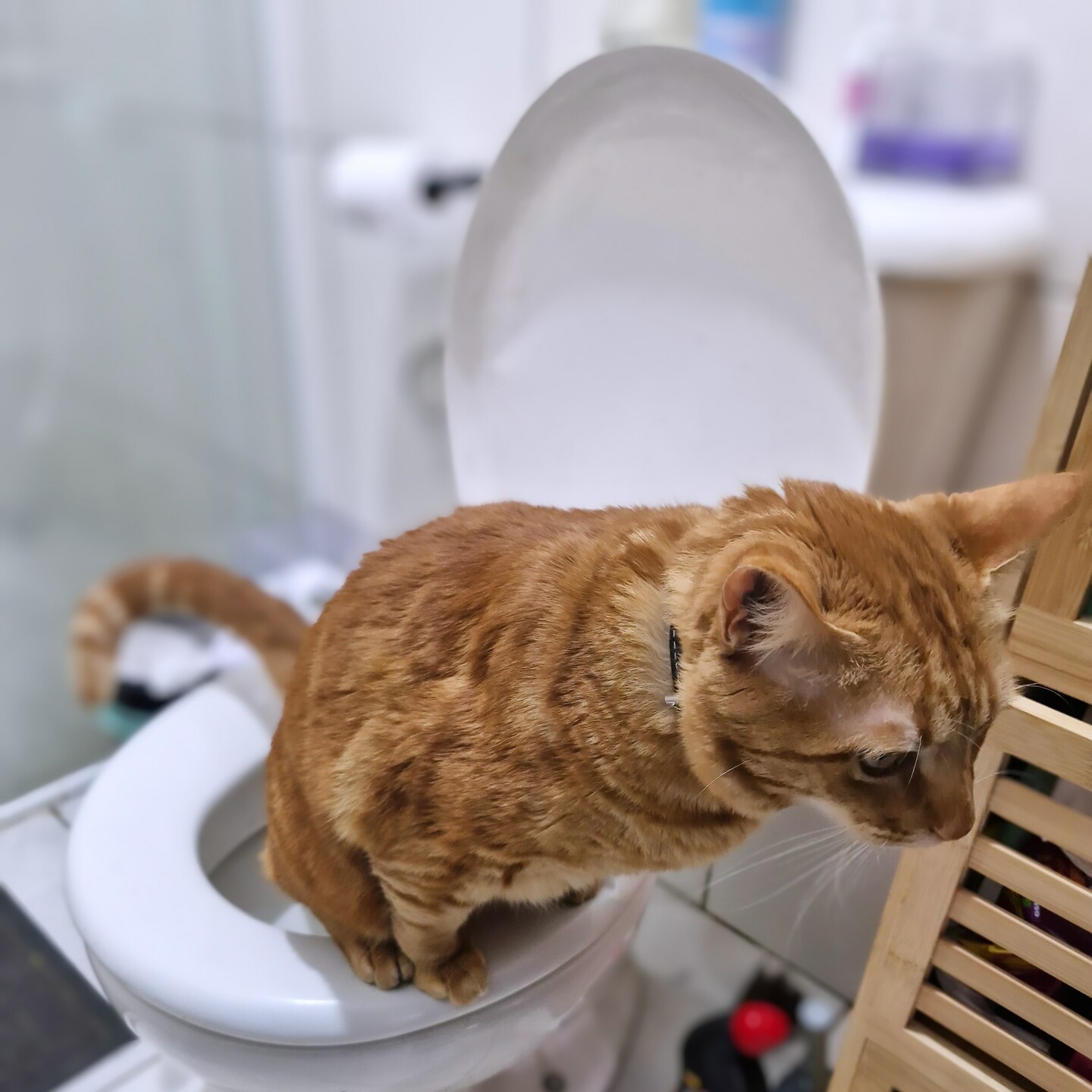 People say orange cats are dumb, but Cat Five here figured out how to use the toilet BY HIMSELF. Zero training or even prompting! #catsofmastodon #gingercats #caturday