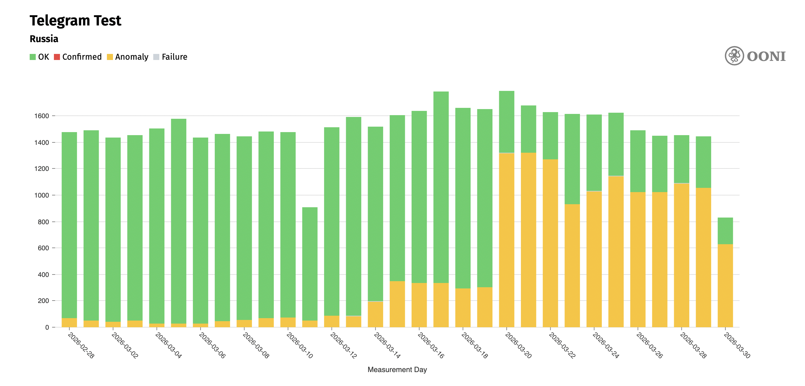 <p>‼️ <a href="/tags/russia/" rel="tag">#Russia</a> has blocked Telegram, one of the most widely used messaging platforms in the country<br><a href="https://explorer.ooni.org/findings/96225549500" rel="nofollow" class="ellipsis" title="explorer.ooni.org/findings/96225549500"><span class="invisible">https://</span><span class="ellipsis">explorer.ooni.org/findings/962</span><span class="invisible">25549500</span></a></p><p>OONI data suggests that many ISPs in Russia began blocking access to Telegram on 20 March 2026.</p><p>This follows blocks of other major services, including WhatsApp, Signal, Instagram, and numerous independent news outlets.</p><p><a href="/tags/ooni/" rel="tag">#ooni</a> <a href="/tags/opensource/" rel="tag">#opensource</a> <a href="/tags/telegram/" rel="tag">#telegram</a> <a href="/tags/censorship/" rel="tag">#censorship</a></p>