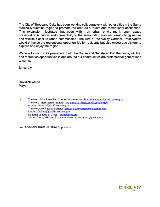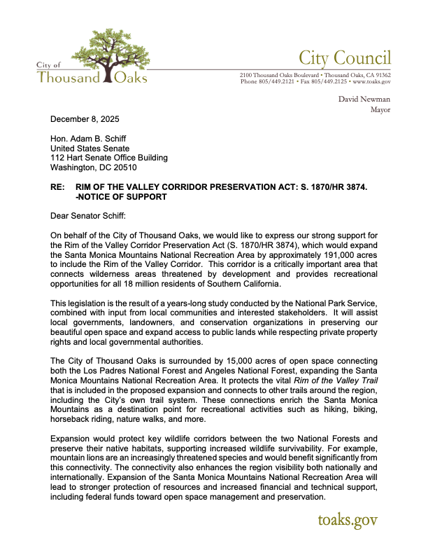 2. Today, on the city's behalf, I signed a letter of support for the Rim of the Valley initiative that would add nearly 200,000 acres to the Santa Monica National Recreation Area, mostly to our north and east, creating a true ring of green around our entire area. The city has supported this initiative for several years running. I'll post a link with more information in comments.