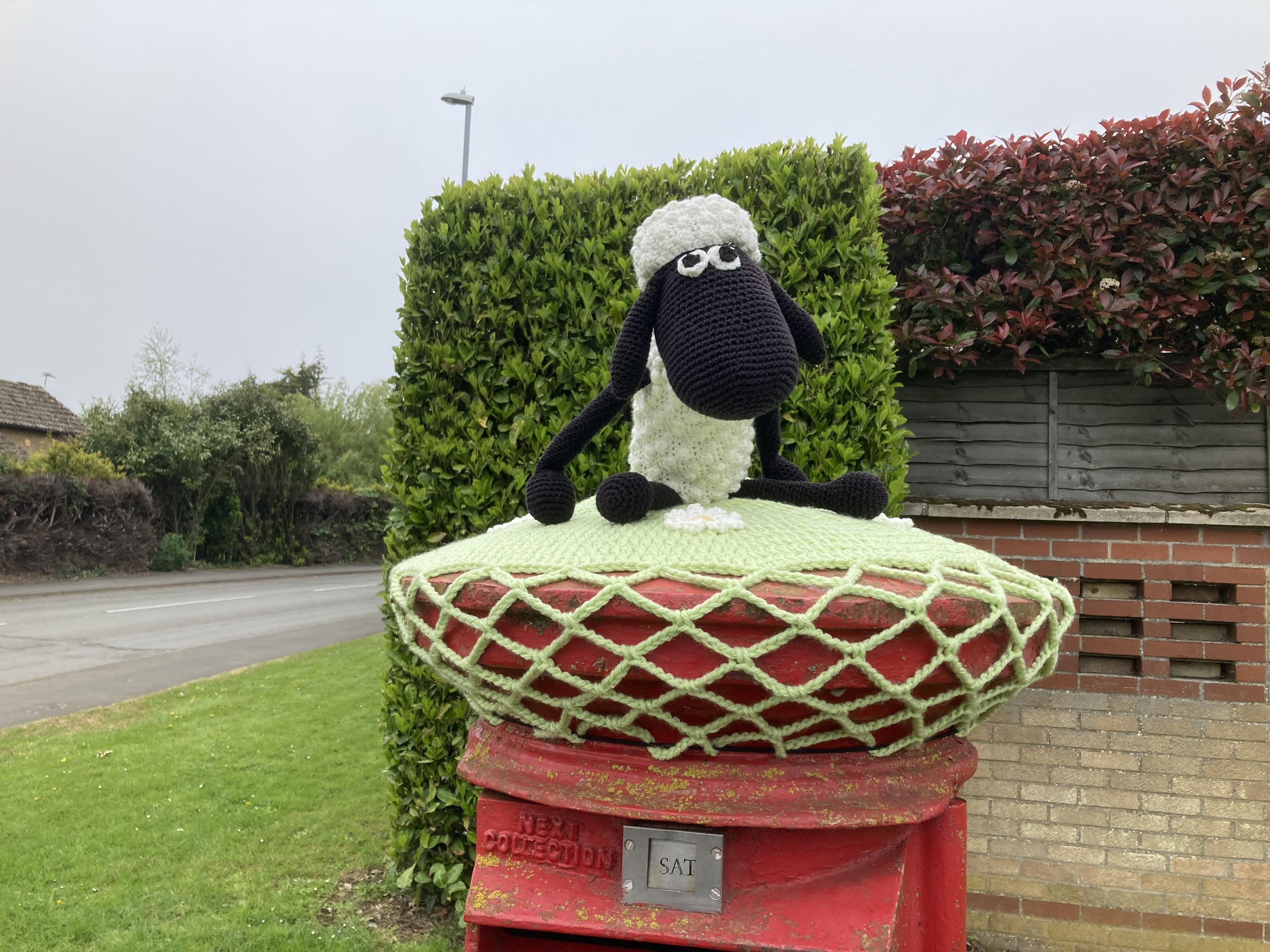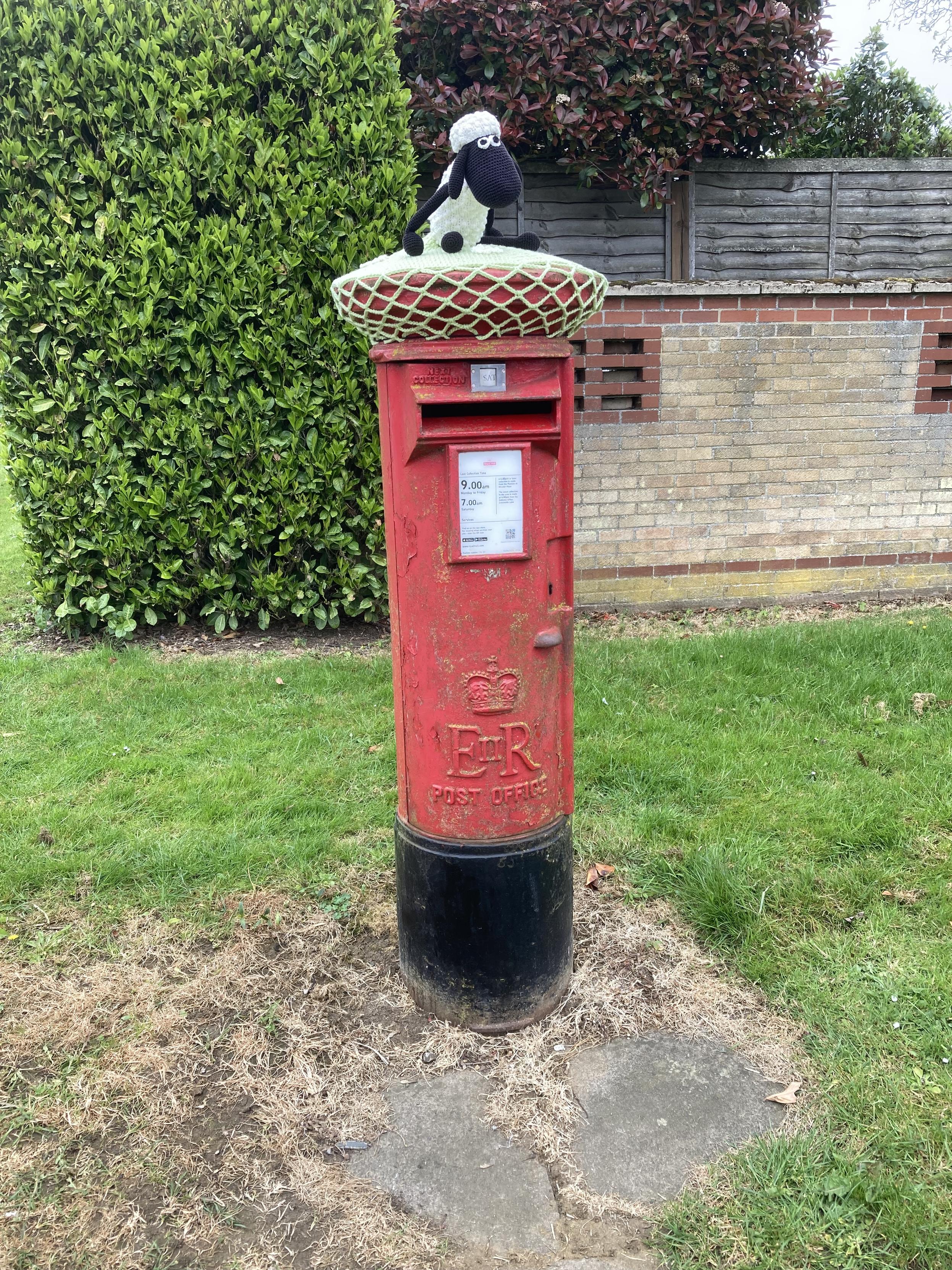 Another crocheted pillar box topper has appeared around the corner from where I live. This time, it’s a rather good version of Shaun the Sheep. Shaun is leaning forward a bit in these photos I took a few days ago but when I drove past this morning I noticed someone had restored him to the correct upright position.