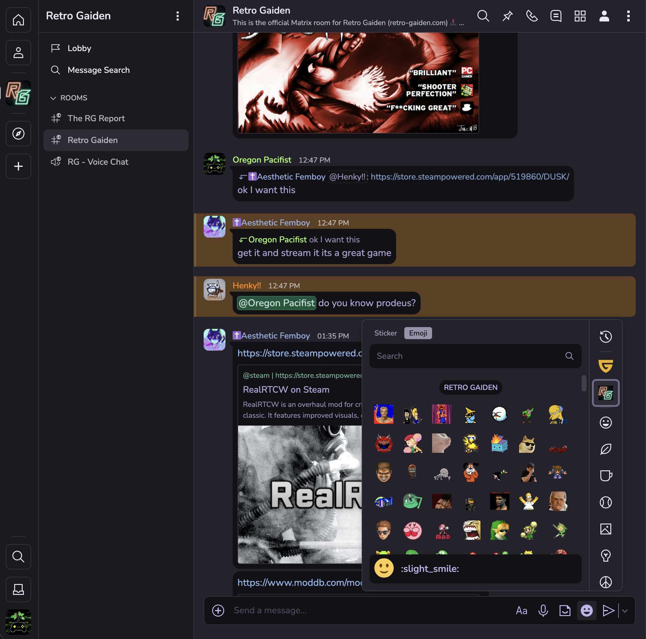 <p>If you prefer real-time chat & have a general distain for big tech, Retro Gaiden has a Matrix room for you to join <img src="/proxy/emoji/19498/cb714780db.gif" class="emoji" alt=":rg4:" title=":rg4:"> <img src="https://neodb.social/media/emoji/retro-gaiden.com/matrixlogo.png" class="emoji" alt=":matrixlogo:" title=":matrixlogo:"> 💬</p><p>The Cinny Matrix client is recommended so all the custom emojis are visible & usable. The room has end to end encryption enabled 🔒 </p><p>Retro Gaiden Matrix chat room: <a href="https://matrix.to/#/!tJ8DAjglJjZx1ynIzWgwevQvDOKE_PE8F7yS8n21-IY?via=matrix.org" rel="nofollow" class="ellipsis" title="matrix.to/#/!tJ8DAjglJjZx1ynIzWgwevQvDOKE_PE8F7yS8n21-IY?via=matrix.org"><span class="invisible">https://</span><span class="ellipsis">matrix.to/#/!tJ8DAjglJjZx1ynIz</span><span class="invisible">WgwevQvDOKE_PE8F7yS8n21-IY?via=matrix.org</span></a></p><p>The RG Report (for viewing and discussing RG moderation reports): <a href="https://matrix.to/#/#the-rg-report:matrix.org" rel="nofollow" class="ellipsis" title="matrix.to/#/#the-rg-report:matrix.org"><span class="invisible">https://</span><span class="ellipsis">matrix.to/#/#the-rg-report:mat</span><span class="invisible">rix.org</span></a></p><p>Cinny: <a href="https://app.cinny.in" rel="nofollow"><span class="invisible">https://</span>app.cinny.in</a></p><p><a href="/tags/guilded/" rel="tag">#Guilded</a> <a href="/tags/discord/" rel="tag">#Discord</a> <a href="/tags/chat/" rel="tag">#Chat</a> <a href="/tags/matrix/" rel="tag">#Matrix</a> <a href="/tags/decentralization/" rel="tag">#Decentralization</a></p>