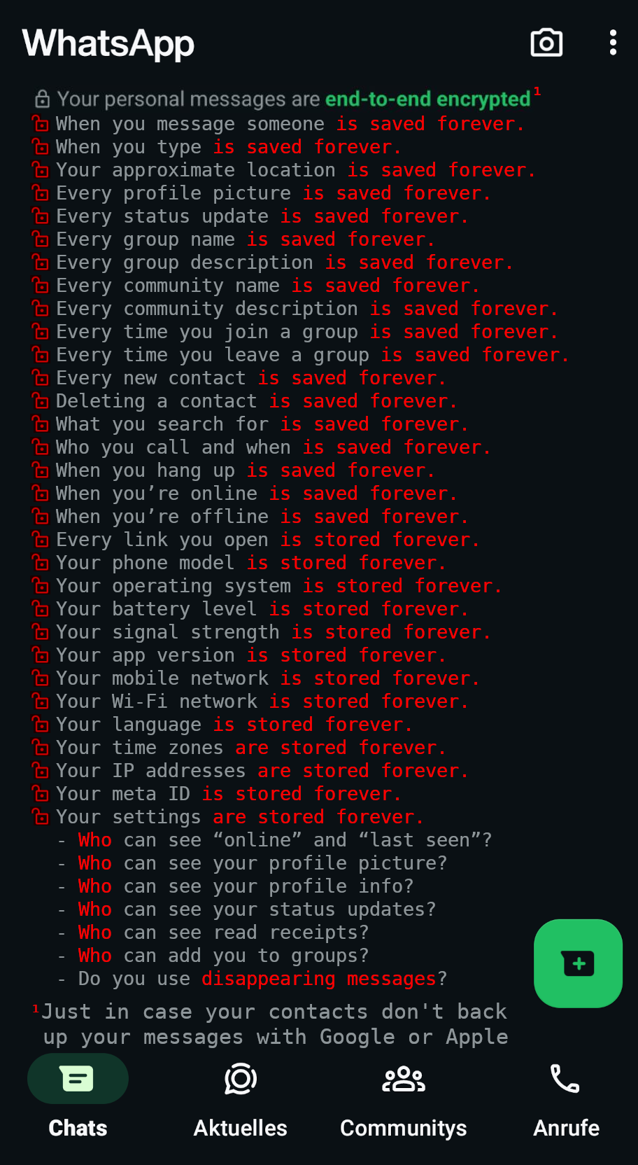 <p>End-to-End Encryption is good but metadata protection counts as much. Names, group descriptions and memberships, avatars, who talks to whom ... </p><p>Both <a href="/tags/deltachat/" rel="tag">#deltachat</a> and <a href="/tags/signal/" rel="tag">#signal</a> go to great length to protect all the metadata that WhatsApp grants itself gratuitously. <a href="/tags/matrix/" rel="tag">#Matrix</a> stores similar scales of metadata on their servers, even if you can choose which server stores it.</p><p>Everything is better than <a href="/tags/telegram/" rel="tag">#Telegram</a> which additionally stores message contents in all group chats/channels and most 1:1 chats.</p>