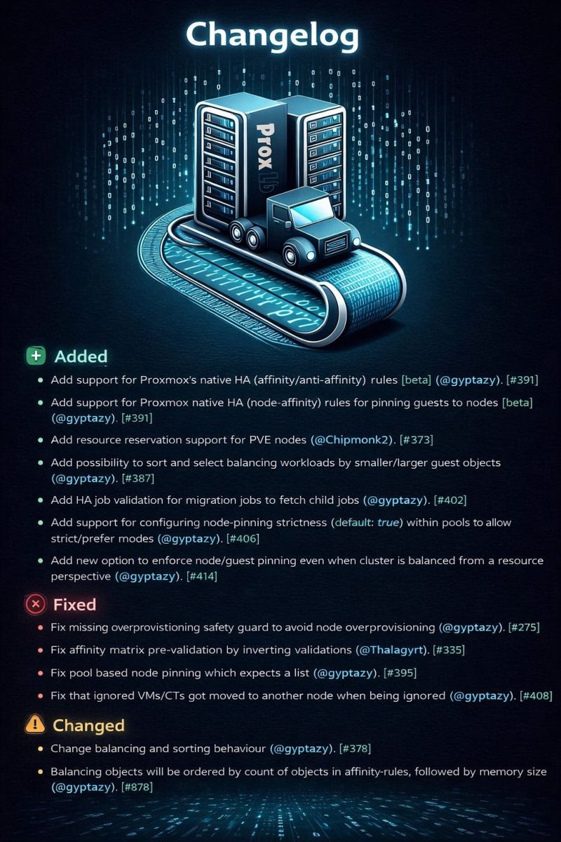 ProxLB 1.1.11 was released, focusing on deeper integration and smarter balancing for Proxmox VE clusters. This version introduces a beta integration with Proxmox’s native HA and affinity/anti-affinity rules (please report any kind of bugs!), allowing ProxLB to work seamlessly with existing placement constraints instead of duplicating them.