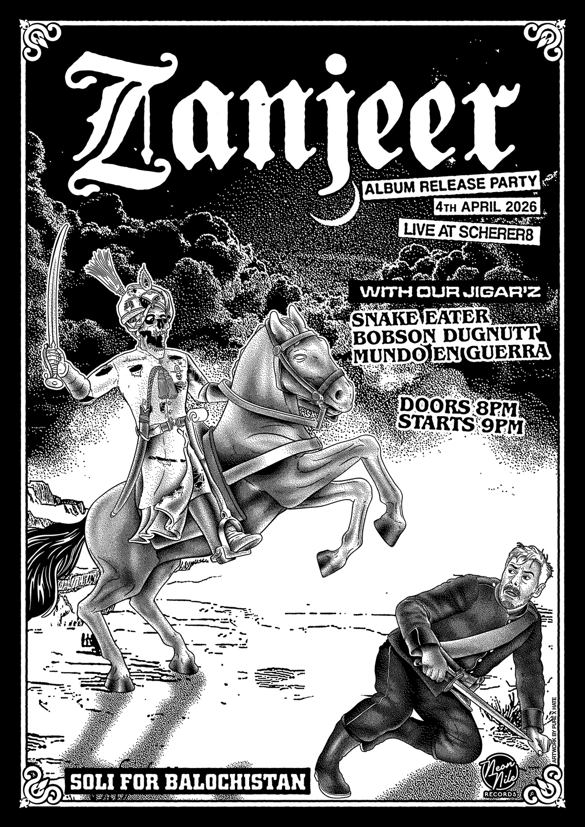 <p>Scherer 8, Saturday, April 4 at 08:00 PM GMT+2</p><p>We in Zanjeer are happy to announce for April 4th the release show for our new LP "Seher-e-Maqhoor" (Dawn of the Oppressed) . Zanjeer is a hardcore punk band from Germany that sings primarily in Urdu language that's native to Pakistan and India. Our lyrics address issues faced by the marginalized people of both the Global North as well as the Global South.</p><p></p><p>This event which will happen at Scherer8, is a donation based soli for victims of the ongoing colonial oppression in Balochistan, a region divided between Iran and Pakistan who's inhabitants face horrific circumstances and who's natural resources are plundered constantly.</p><p></p><p>We'll be joined by our friends in Snake Eater (Netherlands), Bobson Dugnutt (Italy), and fellow Berlin punks Mundo En Guerra.</p><p></p><p>Doors at 8, starts at 9.</p><p></p><p><a href="https://zanjeer.bandcamp.com/" target="_blank">https://zanjeer.bandcamp.com/</a></p><p><a href="https://snakeeater.bandcamp.com/album/al-hakam" target="_blank">https://snakeeater.bandcamp.com/album/al-hakam</a></p><p><a href="https://bobsondugnutt.bandcamp.com/album/sell-me-lies" target="_blank">https://bobsondugnutt.bandcamp.com/album/sell-me-lies</a></p><p><a href="https://mundoenguerra.bandcamp.com/album/demo" target="_blank">https://mundoenguerra.bandcamp.com/album/demo</a></p><p></p>