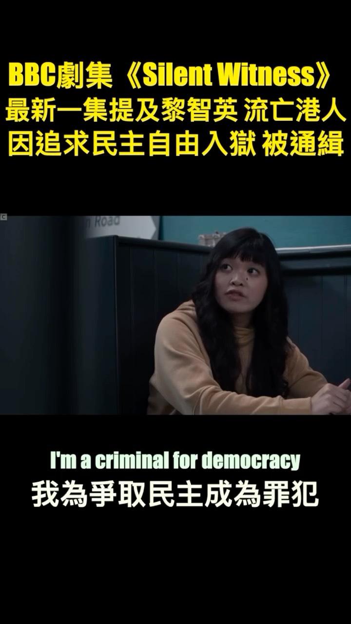 <p>英國《BBC》製作和播放的長壽劇集《Silent Witness》,今年二月播出第 29 季,而在日前播出的最新一集,當中有一段提到黎智英、流亡港人。</p><p>在該集劇集中,一名流亡港人女子,形容自己因為爭取自由被威脅、通輯,而她做過的只是策劃示威要求釋放黎智英。劇集角色又在討論中形容,黎智英是香港富商和和平的民主倡議者,他留在香港為自由而戰,但被港府被家中帶走再單獨囚禁,該名流亡港人女子又指自己不介意留下 DNA 樣本,日後認屍都較方便。<br><a href="https://www.instagram.com/p/DVfzHJGCR0z/" rel="nofollow" class="ellipsis" title="www.instagram.com/p/DVfzHJGCR0z/"><span class="invisible">https://</span><span class="ellipsis">www.instagram.com/p/DVfzHJGCR0</span><span class="invisible">z/</span></a></p>
