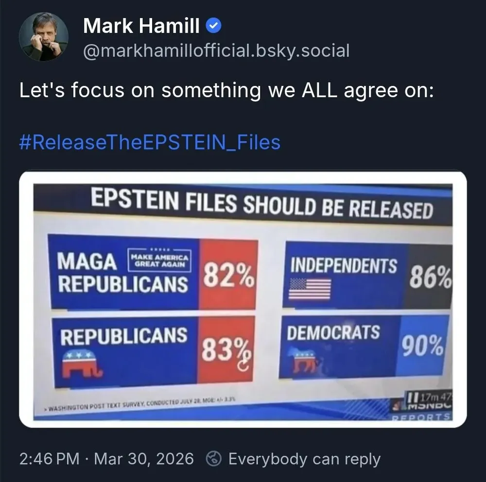 <p>One of the few things everyone agrees on:</p><p>Release the <a href="/tags/epstein/" rel="tag">#Epstein</a> Files.</p>
