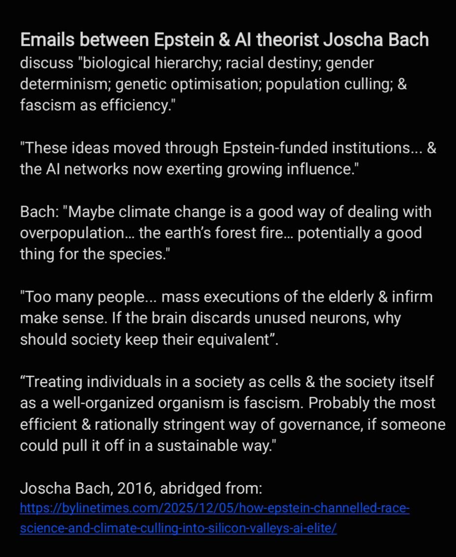 <p>"Maybe climate change is a good way of dealing with overpopulation"</p><p>~Epstein-funded tech fascist Joscha Bach</p><p>Big Tech has long discussed which of us are worth saving. Their answer is "the richer the worthier."</p><p>Via Musk, Thiel, et al, this fascist eugenics is now operating as US Trump govt policy</p><p><a href="https://bylinetimes.com/2025/12/05/how-epstein-channelled-race-science-and-climate-culling-into-silicon-valleys-ai-elite/" rel="nofollow" class="ellipsis" title="bylinetimes.com/2025/12/05/how-epstein-channelled-race-science-and-climate-culling-into-silicon-valleys-ai-elite/"><span class="invisible">https://</span><span class="ellipsis">bylinetimes.com/2025/12/05/how</span><span class="invisible">-epstein-channelled-race-science-and-climate-culling-into-silicon-valleys-ai-elite/</span></a></p><p>Millions are dying every year from govt inaction on climate:</p><p><a href="https://www.who.int/news/item/29-10-2025-climate-inaction-is-claiming-millions-of-lives-every-year--warns-new-lancet-countdown-report" rel="nofollow" class="ellipsis" title="www.who.int/news/item/29-10-2025-climate-inaction-is-claiming-millions-of-lives-every-year--warns-new-lancet-countdown-report"><span class="invisible">https://</span><span class="ellipsis">www.who.int/news/item/29-10-20</span><span class="invisible">25-climate-inaction-is-claiming-millions-of-lives-every-year--warns-new-lancet-countdown-report</span></a></p><p><a href="/tags/uspol/" rel="tag">#USPol</a> <a href="/tags/eupol/" rel="tag">#EUPol</a> <a href="/tags/epsteinfiles/" rel="tag">#EpsteinFiles</a> <a href="/tags/eugenics/" rel="tag">#Eugenics</a> <a href="/tags/climatepurge/" rel="tag">#ClimatePurge</a> <a href="/tags/news/" rel="tag">#news</a> <a href="/tags/racism/" rel="tag">#racism</a> <a href="/tags/bigtech/" rel="tag">#BigTech</a> .</p>