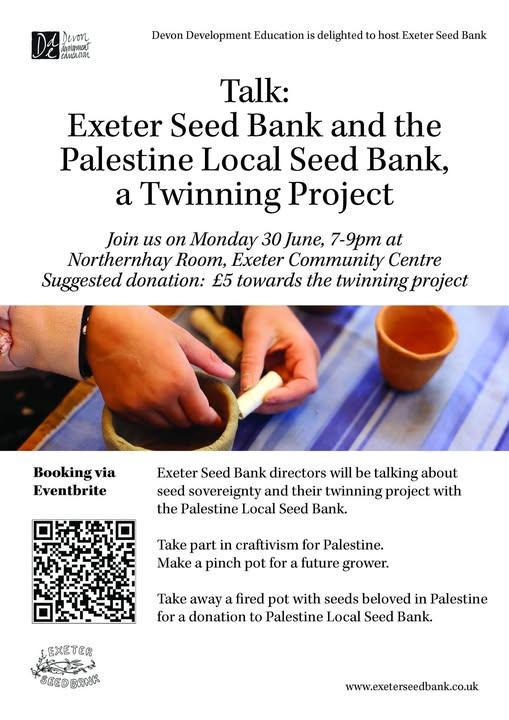 #ExeterSeedBank directors will be talking about seed sovereignty and their twinning project with the Palestine Local Seed Bank. Take part in craftivism for Palestine.