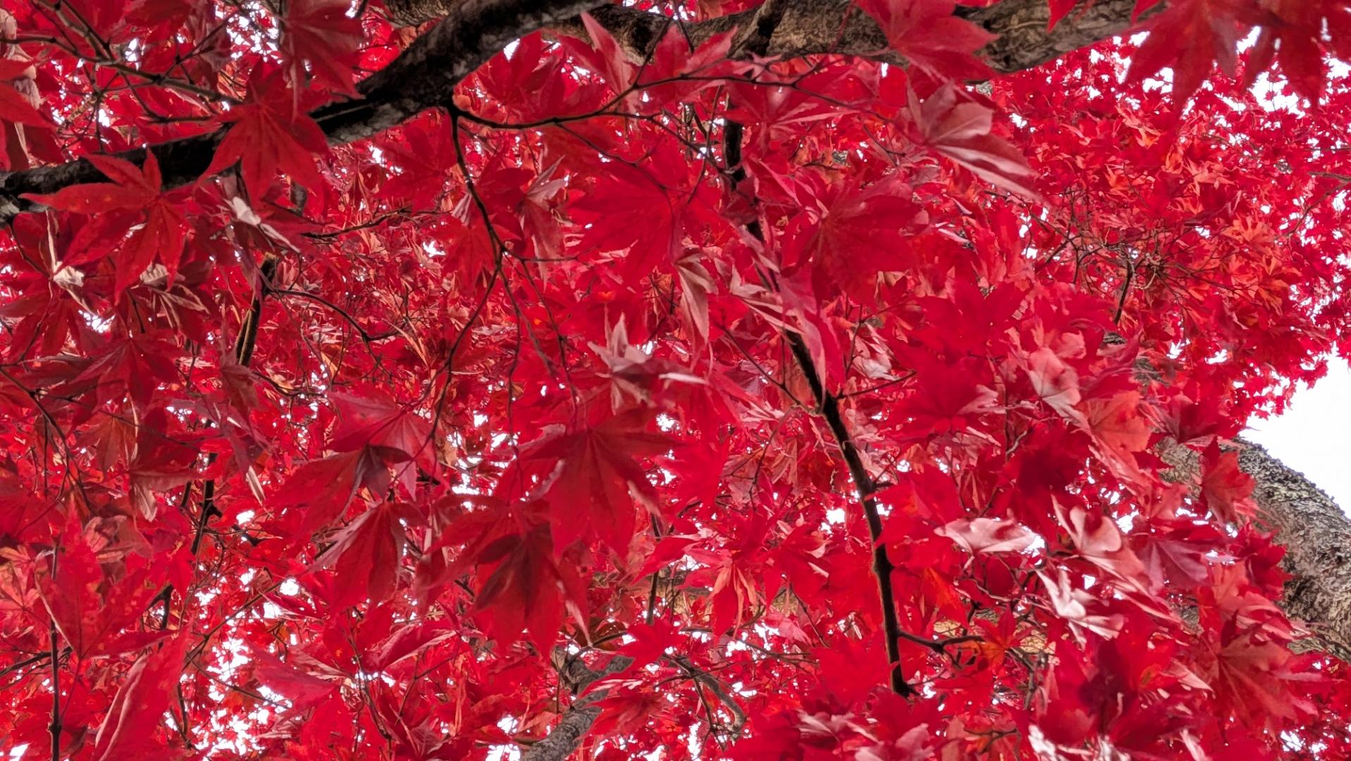 Leaves of a Japanese Maple tree in vibrant shades of warm red and orange are shining bright in the autumn sun.