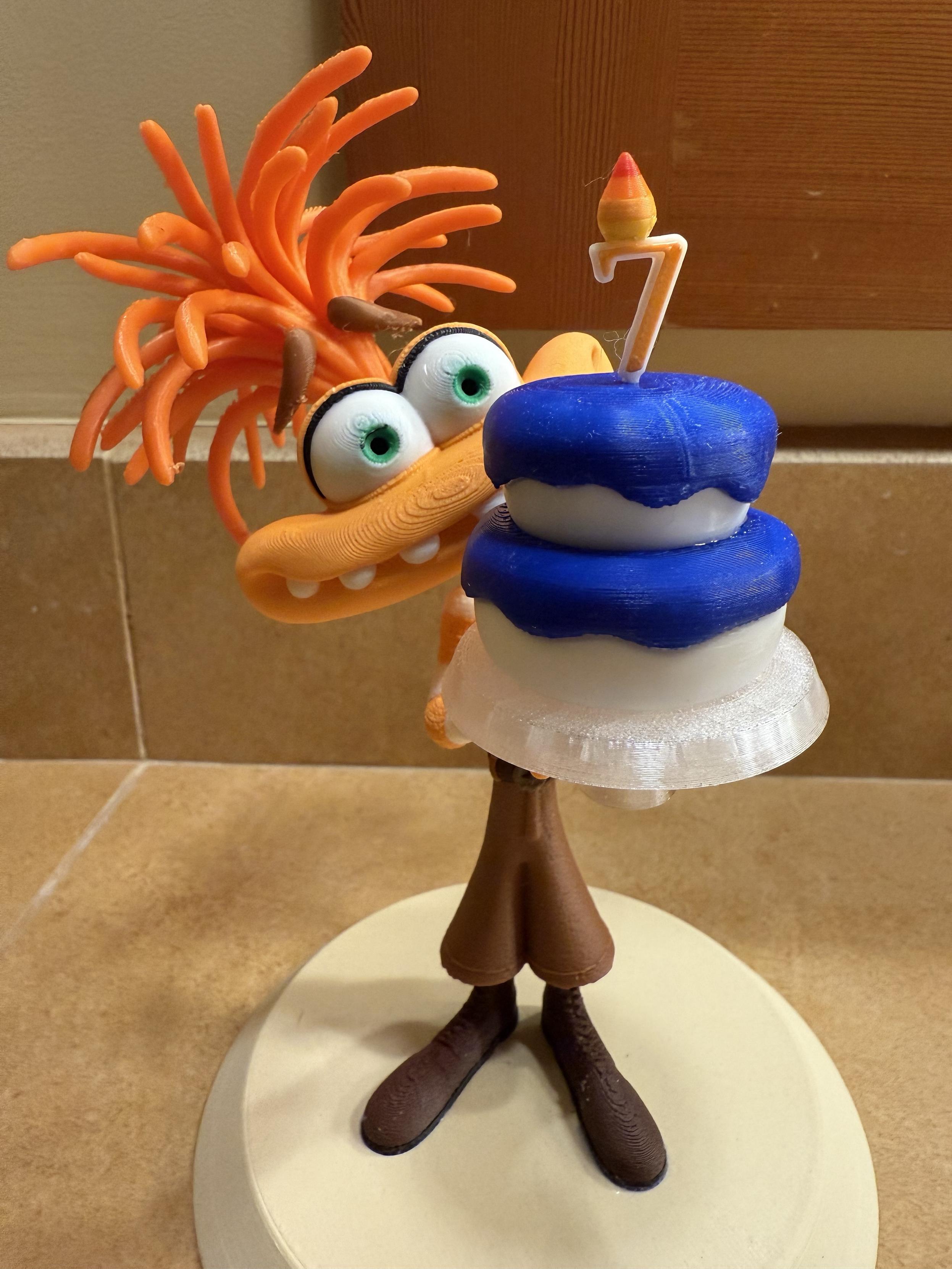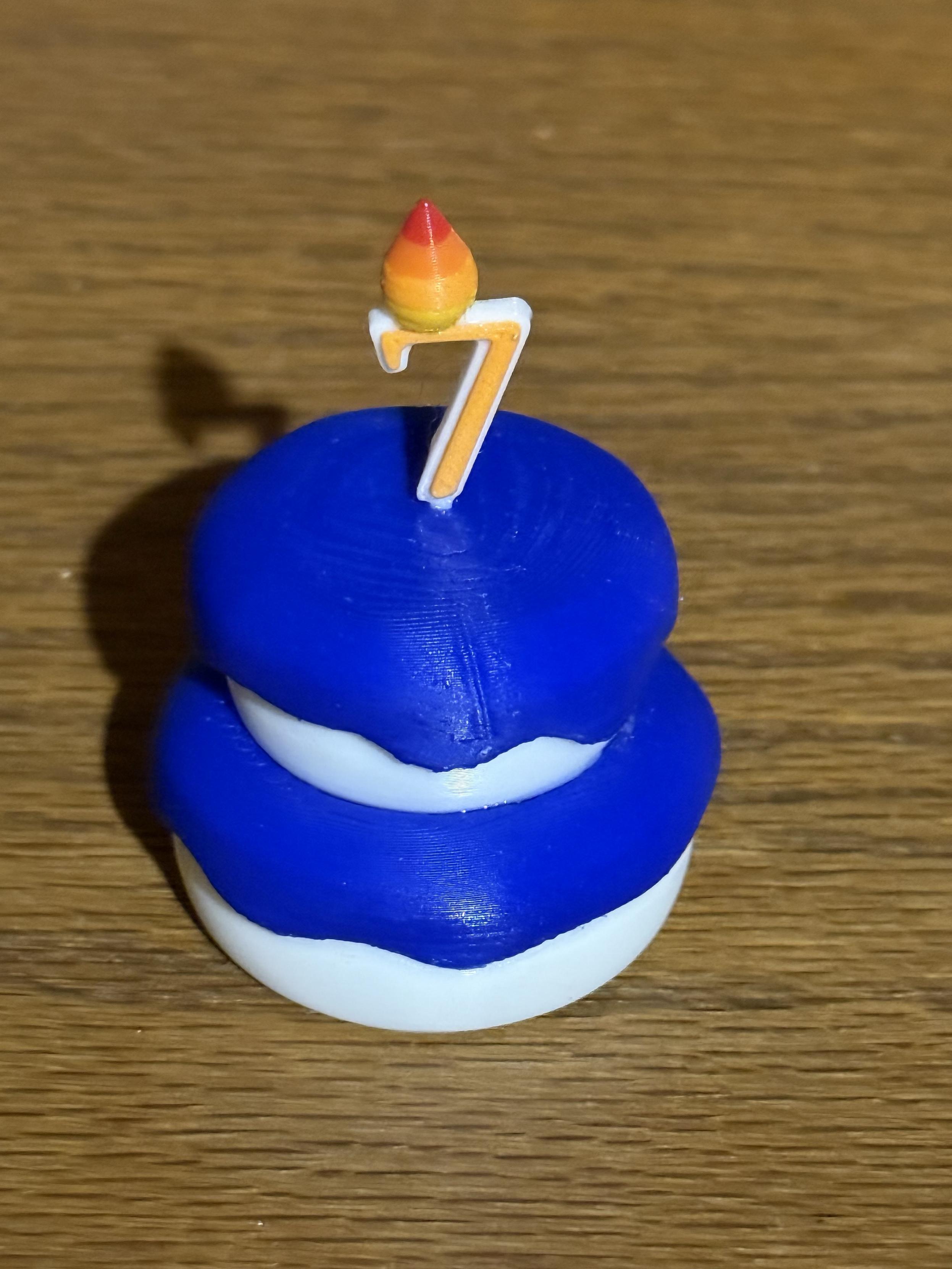 Printed as multiple pieces which I then glued together: hair, head, sweater, hands, pants, legs, base, cake layers, icing, 7 candle, flame, cake plate. Each piece has up to 4 colors. Total of 13 colors in the model.
